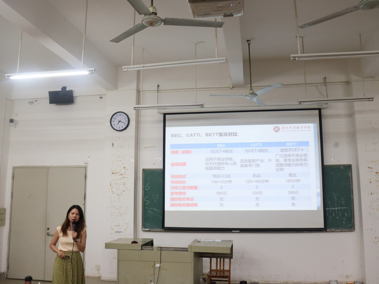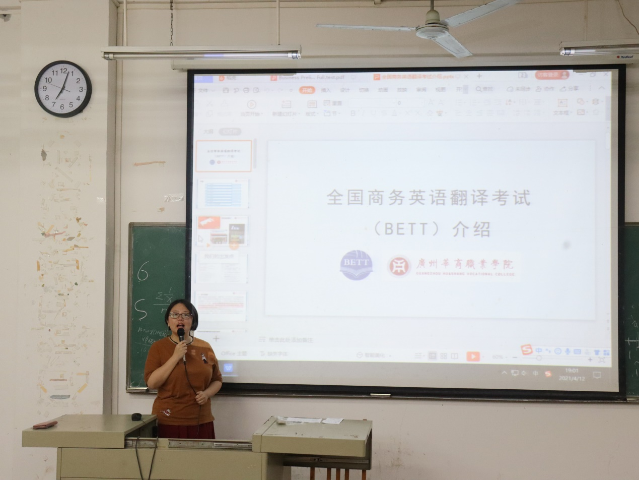 为了进一步加强我院学生对商务英语专业的了解,提高学生的实战能力和实战技能,提升学生就业竞争力和综合素质。2021年4月12日晚上7:00,我院于博学楼B101举行商务英语专题讲座。黄翔老师主持本次讲座,并特邀汤素芹老师现场讲解,参加本次讲座的学生为19级商英专业的学生。