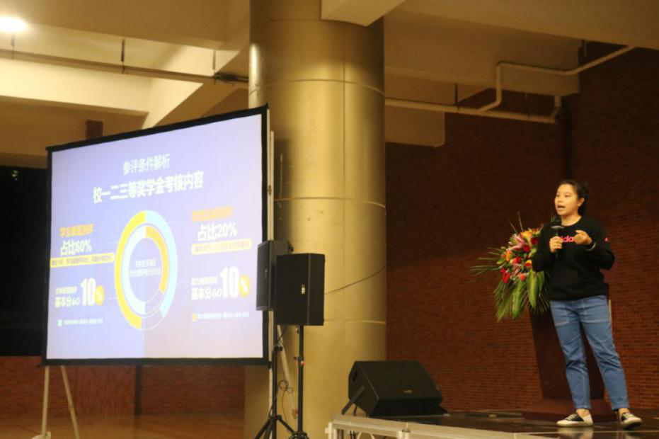 最后,学院奖助贷专员李悦老师向新生们罗列了学院奖助贷、评优评先系列类目,解析了国家奖学金、国家助学金、国家励志奖学金、校奖学金、自强之星以及优秀学生干部、学风建设先进班集体等各个项目的参评条件。现场解答了新生关于勤工助学的申请程序等问题。