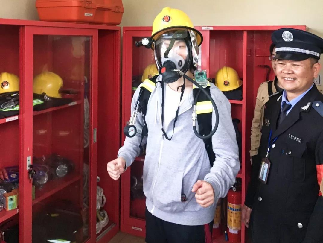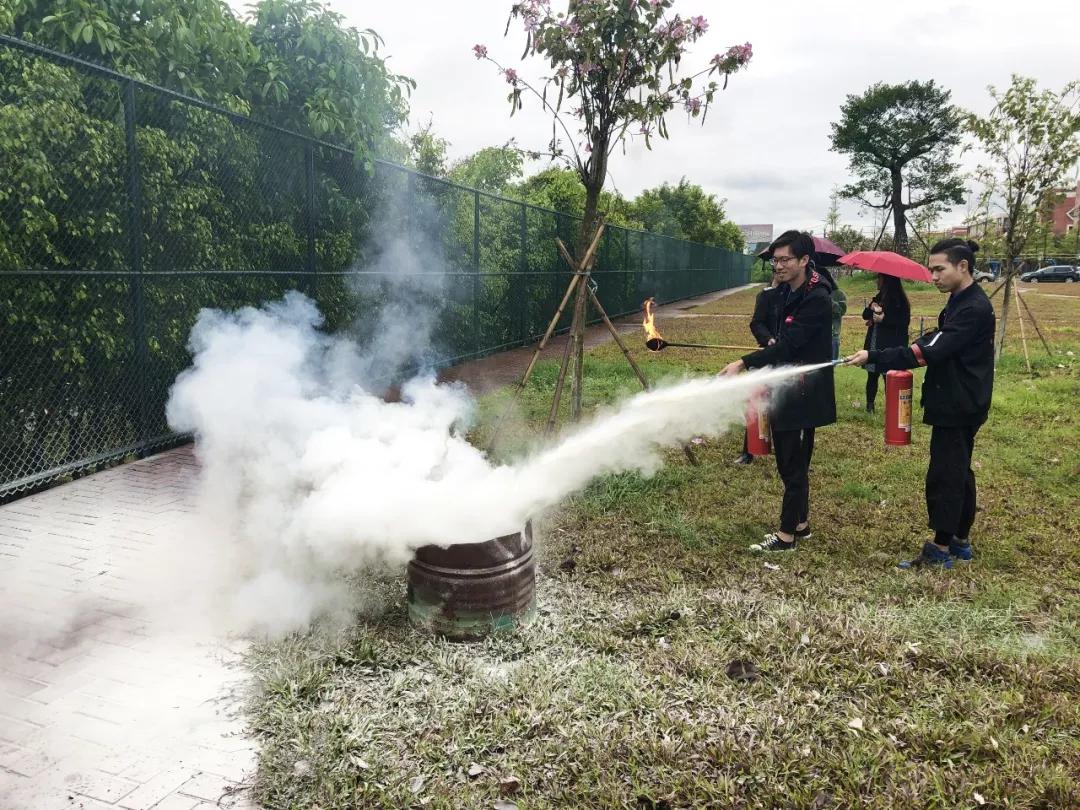 接着,同学们在室外体验了现场灭火的过程。在烈火面前,同学们表现得十分沉着,按照灭火的步骤和方法,将大火迅速扑灭。随后,辅导员助理曾家伟同学主动试穿救火装备体验了一把“消防员”。同学们有序的离开了现场。