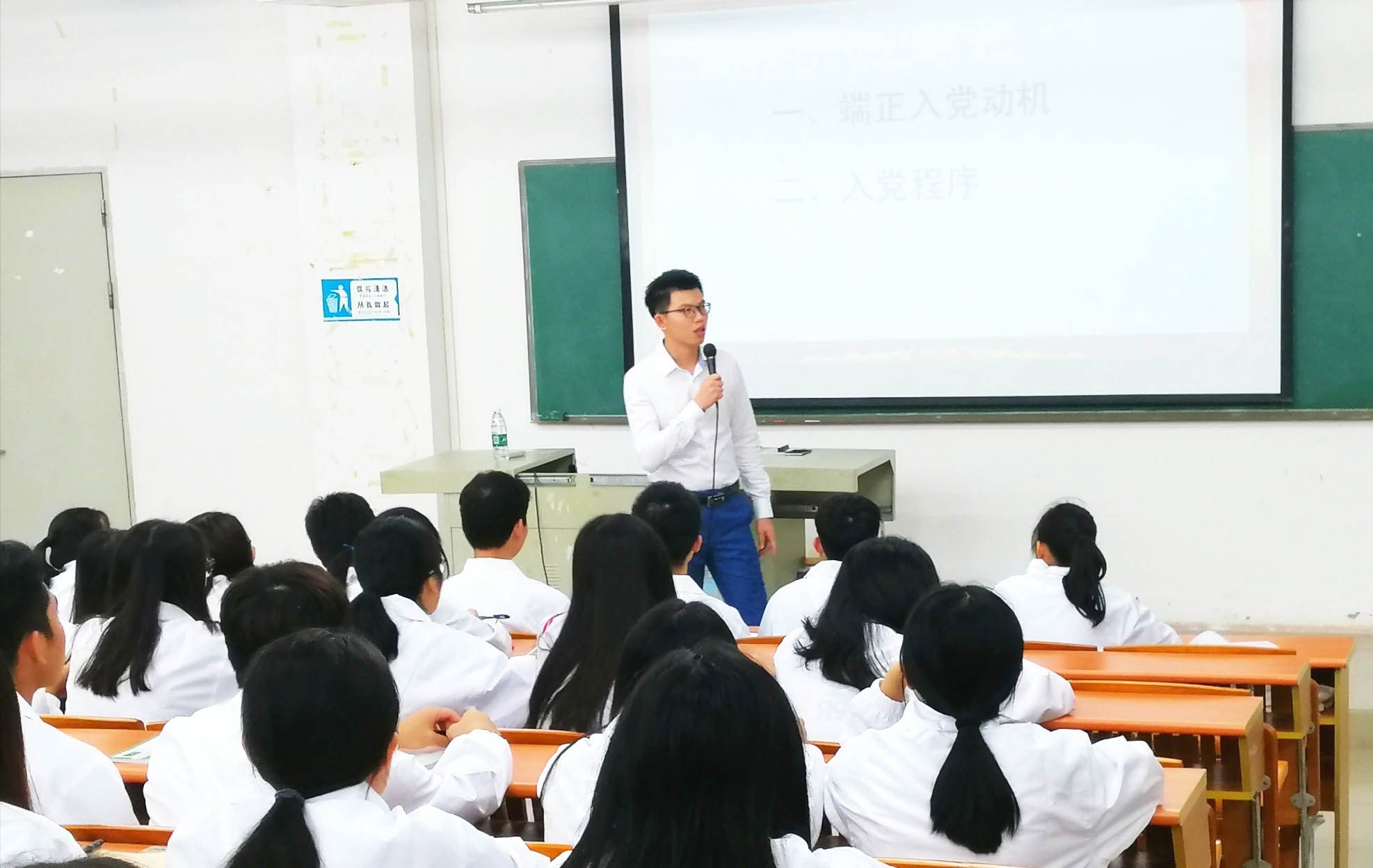 本期党章培训的主题是“端正入党动机,履行时代使命”。杨盛文书记首先围绕着培训主题与学员们进行互动,并讲到实现党的最终目标应该端正入党动机,履行时代使命,保持党的先进性与融恰性。紧接着,杨盛文书记提到,带着坚定的理想信念是入党的根本原因,学员们应该更正自己的不足,发挥先锋模范作用。最后,杨盛文书记讲到党的十九大精神,用习近平主席说的“青年兴则国兴,青年强则国强”来激励学员们带着坚定的理想信念,为人民利益不懈奋斗,书写人生新篇章。