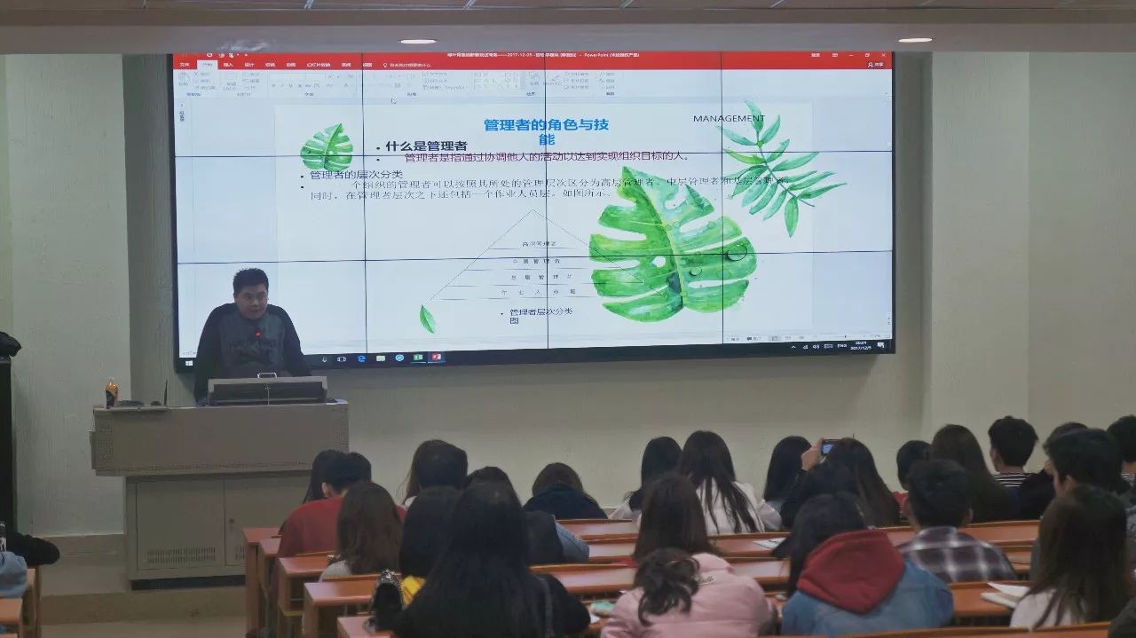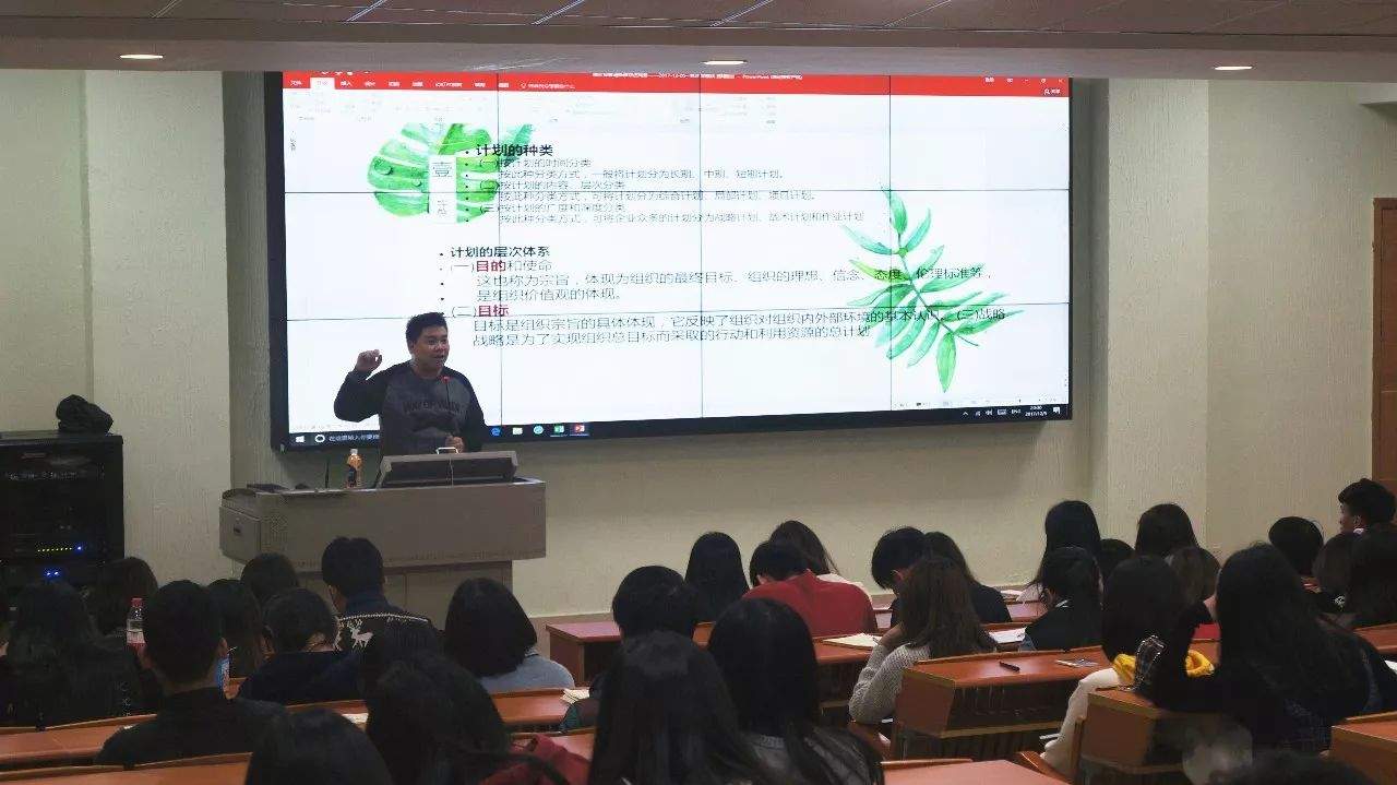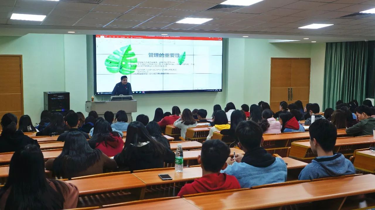 2017年12月5日晚上7点,16级学生经理培训第三讲在博C101开讲,出席本次培训的嘉宾有:电子商务学院副主任沙园松,主讲人为:国贸系教师苏宁。