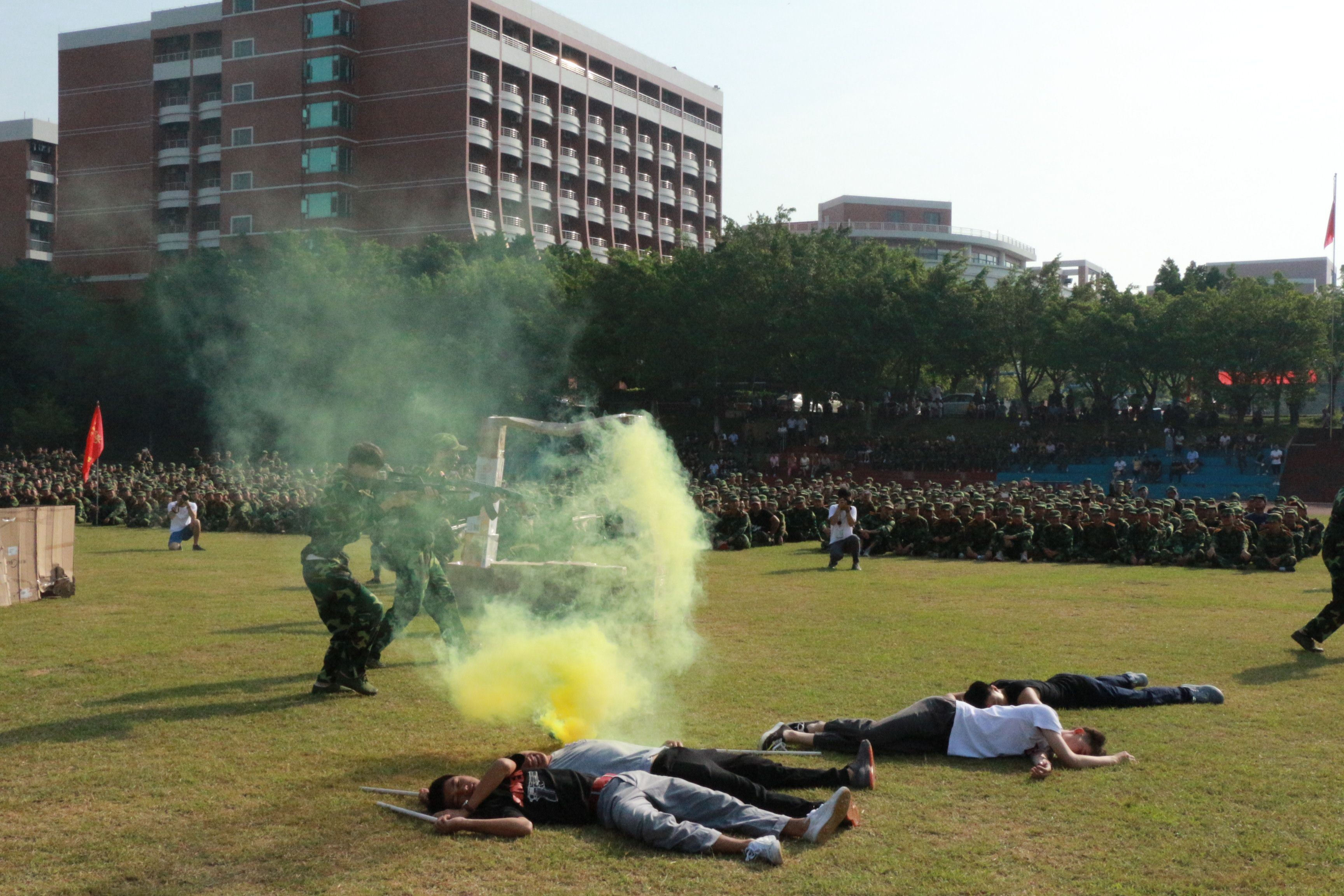 大会伊始,奏国歌,升国旗,礼毕。主持人介绍到场领导,接着由王乐夫院长及承训部队领导一同对17级新生军训成果进行检阅。随后军训团进行汇报表演,各方队的新生们目光坚定,身姿挺拔,整齐划一的从主席团前走过,各方队还带来了精彩表演并以手语操--《国家》感谢教官的教导。最后承训部队领导作大会总结并宣布大会到此结束。