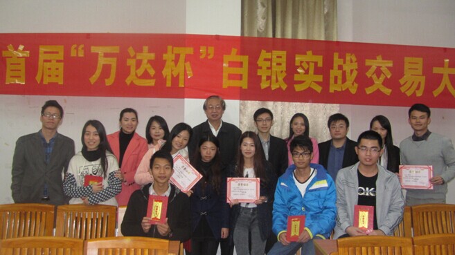 12月4日晚上七点半,我院国际经济与贸易系与万达公司联合举办的首届“万达银杯”白银实战交易大赛颁奖典礼在博学楼A207隆重举行。出席本次颁奖典礼领导、嘉宾有国贸系祁建主任、沙园松副主任、金融教研室潘飞静副主任、万达公司方国旭副总裁、吴杰斌总经理、林熙妍总经理及金融协会全体人员。