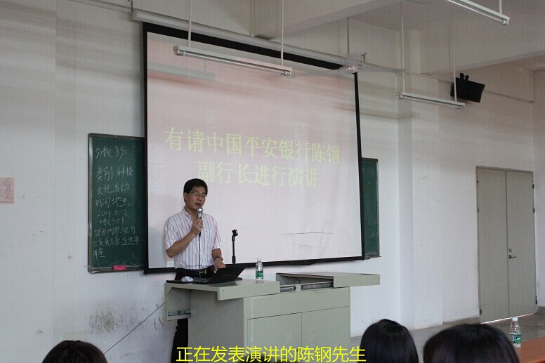 为普及银行业相关知识,了解银行业的发展历程以及加深同学们对银行业的认识。6月12日下午4点,由国贸系主办,金融协会承办的贵金属投资业发展及就业选择知识讲座在博学楼C201隆重举行,特邀到平安银行副行长陈钢先生担任讲座的主讲嘉宾。出席本次大会有国贸系沙园松老师以及金融管理专业老师