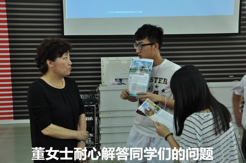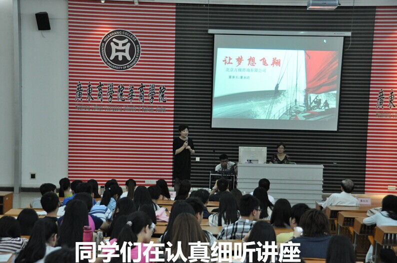 伊始,讲座围绕着“让梦想飞翔”的主题而开展,董永洁董事长首先向大家介绍了美国的基本概况。通过播放出国留学生成功的视频和寄语,并结合在美国留学的生活体验,就大家感兴趣的风土人情、文化、大学的教育体制、教学模式以及毕业后的工作机遇等方面作了一一的介绍,希望学生们可以在留学中实现自己的梦想。而张岩处长则表示无论是在国读书还是出国留学的同学,都要在其专业道路上执着拼搏奋进,冲破高端、成就自我。最后,讲座在热烈的掌声中圆满结束。