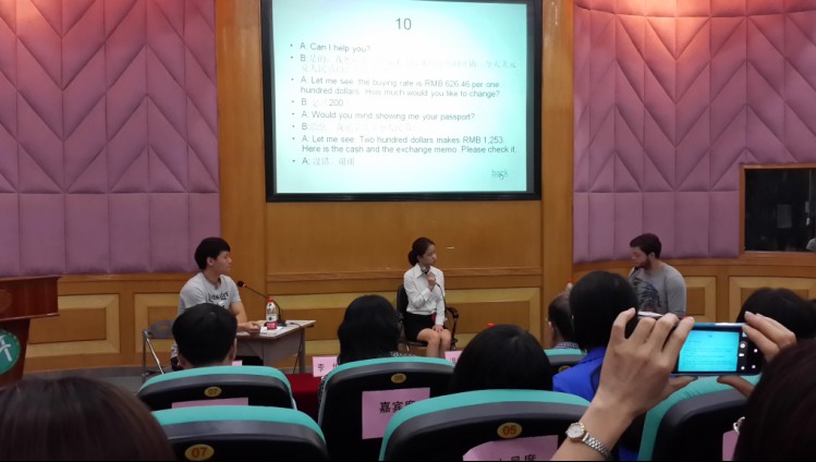 三、对于此类比赛培训,我们要有的放矢。在备战阶段,我们要注意从发音、词汇、句型、现场应对和台风去培训选手。如纠正选手因紧张而产生的不必要尾音(如people后面出现“d”音);加强专业词汇的运用(如此次比赛中没有选手能够正确翻译buying rate买入价);让学生明白语言的使用要注意区分场合(如跟同事交流和发表致辞的说话方式是大相庭径的);注意培养学生良好的心理素质,在台上要展现自信和激情等。