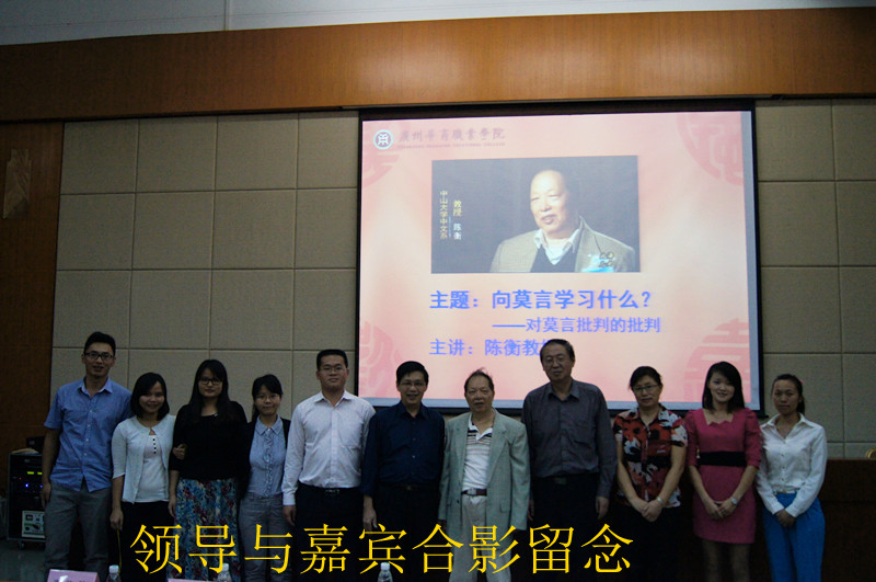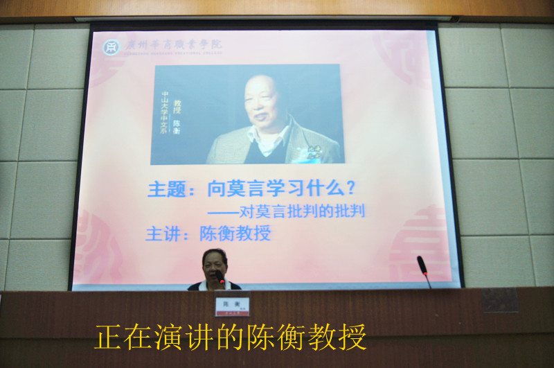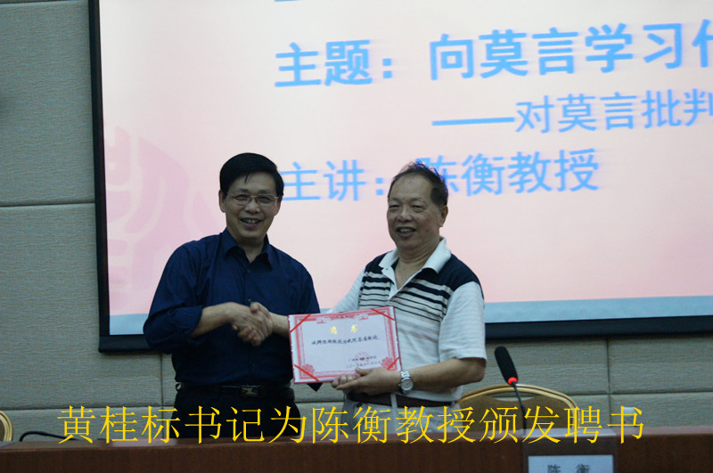 讲座在黄桂标书记的致辞中拉开帷幕。随后,陈衡教授围绕着“向莫言学习什么?——对莫言批判的批判”展开演讲。陈衡教授通过深入研究莫言作品,详细阐述了莫言具有独特文化背景、民族风格、创新的写作手法,以及谦虚不卑,自信不傲的创作精神,从而推翻对莫言批判的九大罪状。陈衡教授还指出当今个人错误观念导致社会观混乱,个人观念应当符合社会主义道德观念。