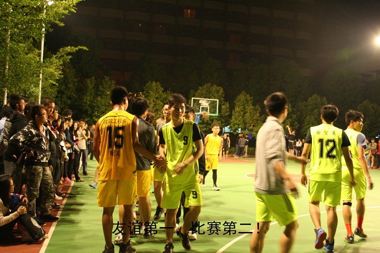 开始,比赛在许星伟裁判员的一声哨响下拉开帷幕,国贸系首先抢得篮板,获得本场第一个得分,双方球员相互不断进行防守、进攻、断球、抢球,赢得了场下观众阵阵喝彩声。国贸系以6分的优势结束了上半场比赛。