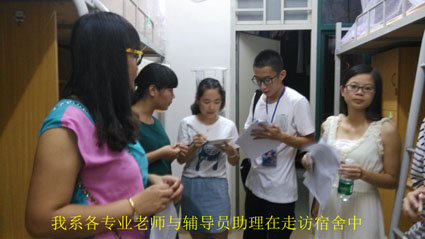 活动开始,黄桂标书记,祁建主任,曹迪副主任,潘虹老师等院系领导老师先后走访了我系D1栋与H8栋的新生宿舍。在了解我系各专业新生情况,介绍院系特色的同时,黄桂标书记不忘介绍一些好的学习方法给新生们,叮嘱同学们好好学习,坚持锻炼,同时多次强调了“有好学生才有好学校”这一思想,并对新一届的同学们给予了高度的评价。本次宿舍走访活动一直持续到晚上10点。