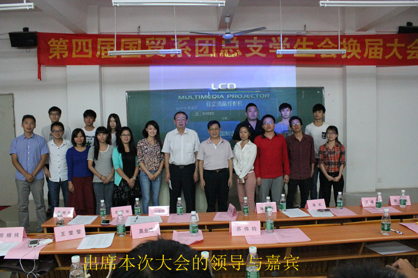 2013年10月16日晚上7点30分,国贸系第四届团总支学生会换届大会在博C101隆重举行。我院党委黄桂标书记、我系祁建主任、党总支副书记潘虹老师、团总支书记于晓林老师、辅导员及专业指导老师出席本次换届大会。