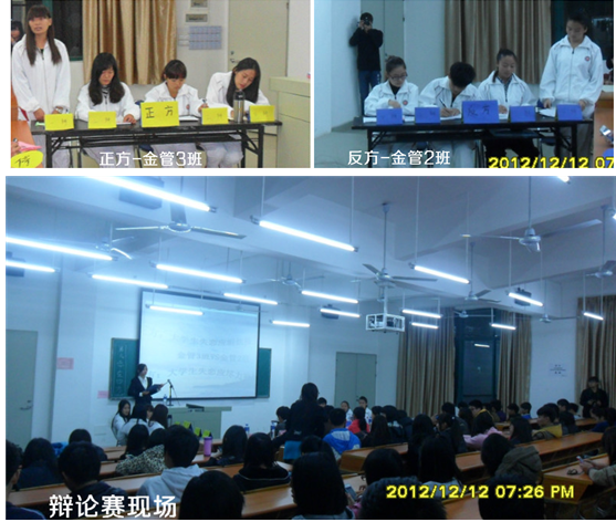 2012年12月12日晚上七点半,国贸系在博学楼C301举行了以“大学生失恋坦然接受还是尽力挽回”为辩题的辩论赛。由主持人蔡文倩介绍出场辩论赛的嘉宾有国贸系主任祁建主任,沙园松老师,李佩娜老师,潘飞静老师和翟羽佳老师。