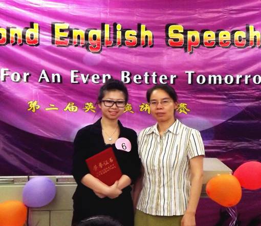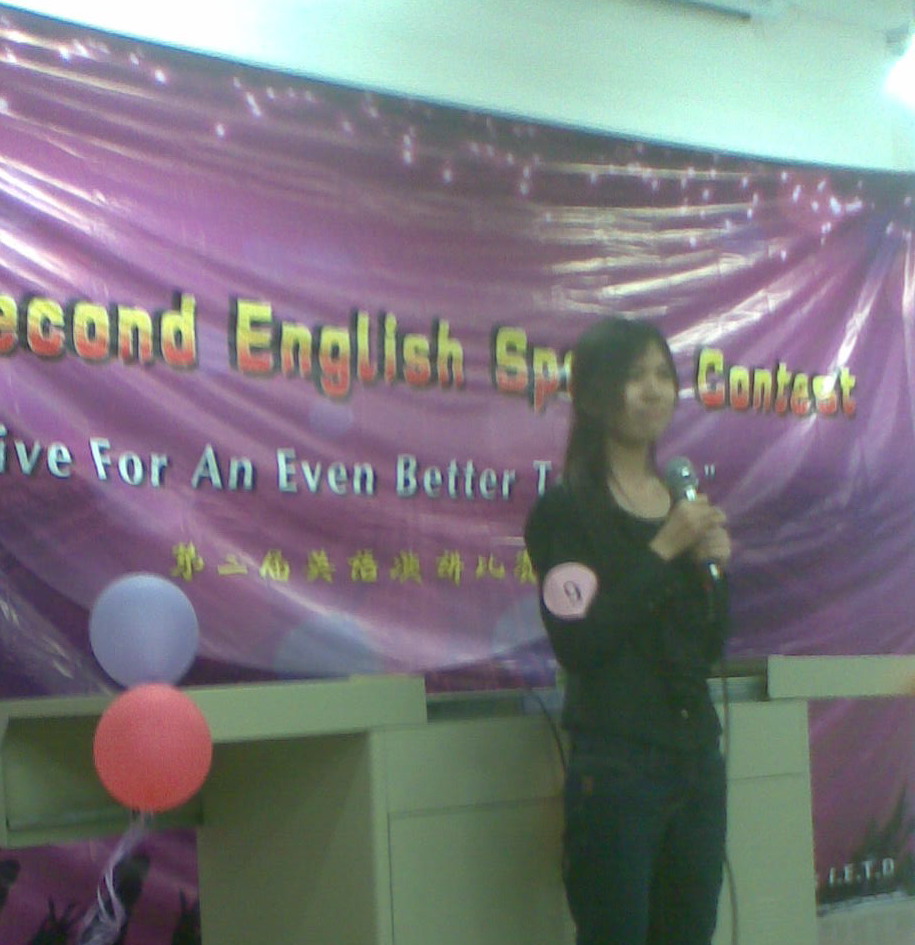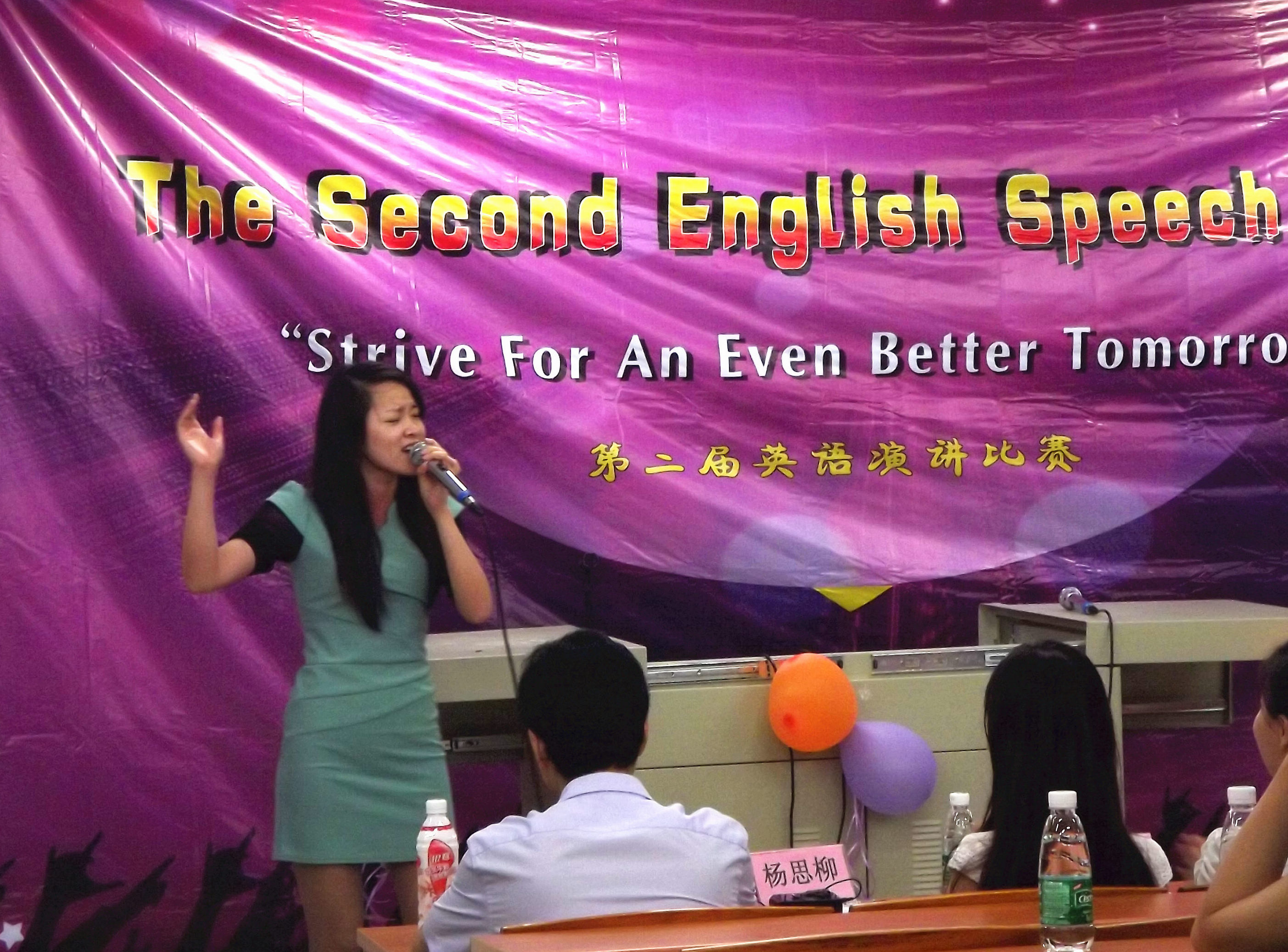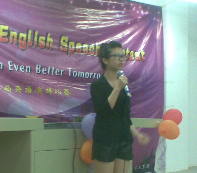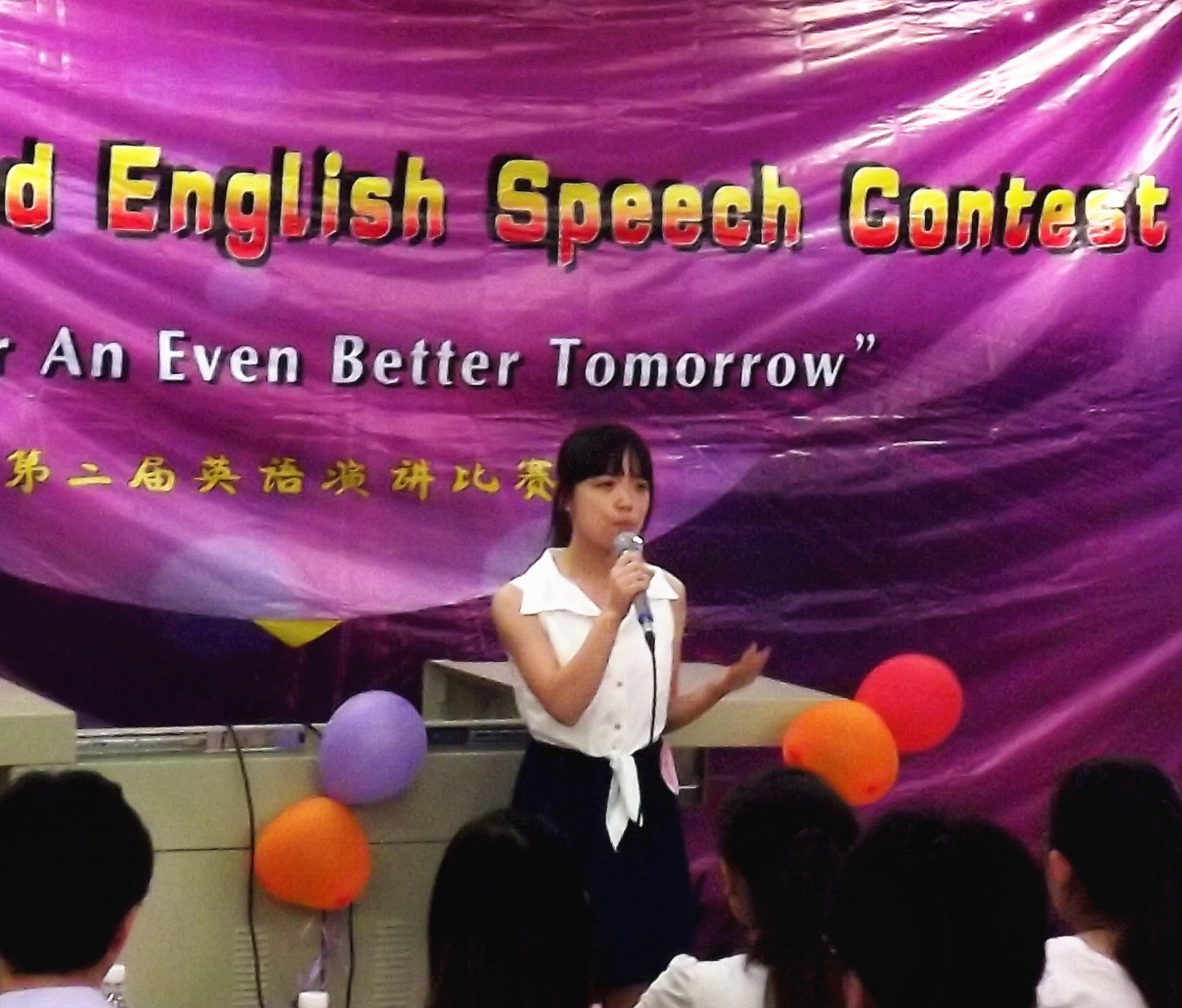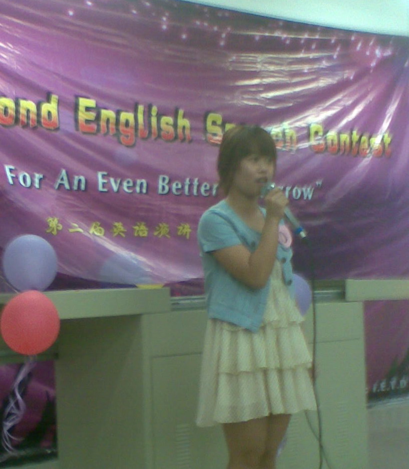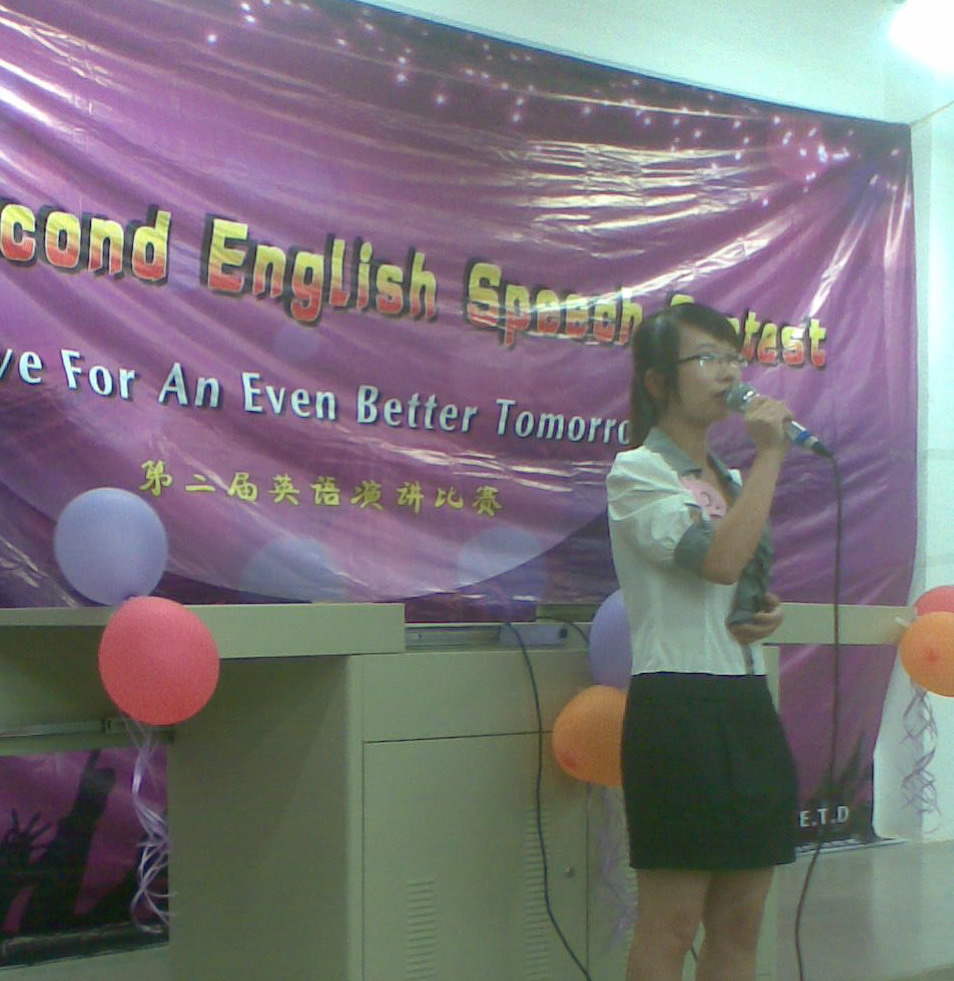 1号选手黄皓映(国贸系11级文秘三班)激昂的英语演讲为活动拉开了序幕
