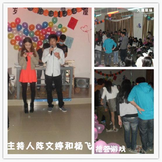 2012年11月12号晚上七点半在博学楼c106,国贸系为单身男女“脱光”创造机会,举行了单身派对。派对在李燕同学精彩的舞蹈中拉开序幕。在主持人陈文婷和杨飞的邀请下,八对男女嘉宾大胆的走上讲台参加抢答游戏。在一轮轮的激烈抢答中,每对搭档为自己脚下成倍缩小的纸张而紧张,这样更拉近了男女嘉宾的距离,同时增进彼此的默契,也引起台下阵阵欢呼声。紧接着的“终极密码”环节,如幸运的搭档或观众,能尝到“美味的”芥末寿司,随着游戏的深入,现场爆笑连连,派对的气氛高涨。随后,胡嘉欣同学的深情演唱《至少还有你》,迷幻全场。不知不觉,到了游戏的最后环节——爱情对对碰,六对男女嘉宾积极参加,在他们默契的配合下很快结束游戏。最后,派对在江宇炀同学演唱的《你是我的眼》动听的歌声中落下帷幕。