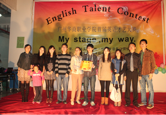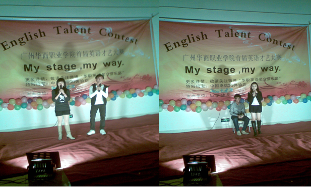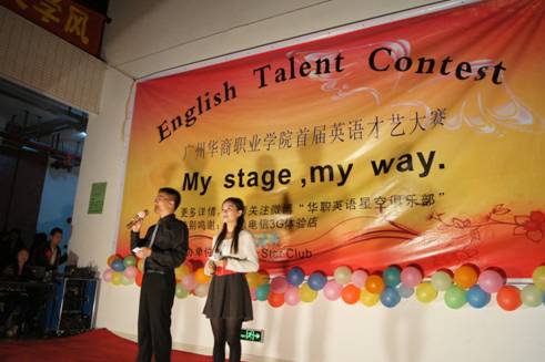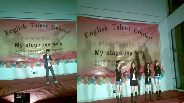 20111126晚,博学楼大厅人声攒动、灯光明亮,以“My Stage, My Way(我的舞台我做主)为主题的广州华商职业学院首届“English Talent Contest”(英语才艺大赛)决赛于当晚19:30在这里隆重召开。