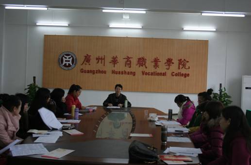 国贸系“高职高专英语教研教改会议”于2012年1月6日下午15点整在广州华商职业学院会议室召开,会议由周岳梅主任主持,大学英语教研室与商务英语教研室全体教师出席了本次会议。