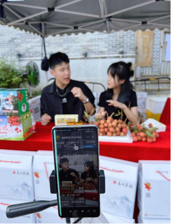 24日下午,国贸学院助农直播团队正式开始首场荔枝直播。经过师生团队积极谋划和充分准备,国贸学院罗海明、易锦萍两位学生主播在现场通过微信直播平台向线上的观众们生动详细地介绍了增城荔枝的品种、特性、购买渠道等,两人还向大家分享荔枝背后的精彩故事,吸引了众多游客围观购买和点赞。