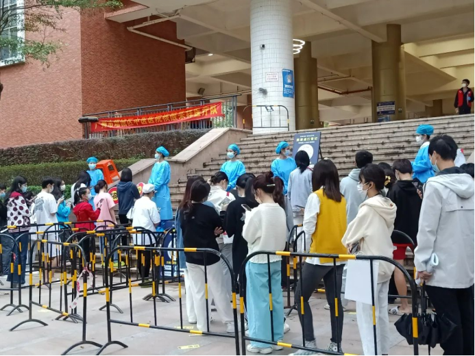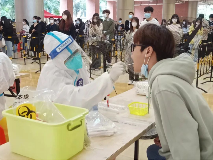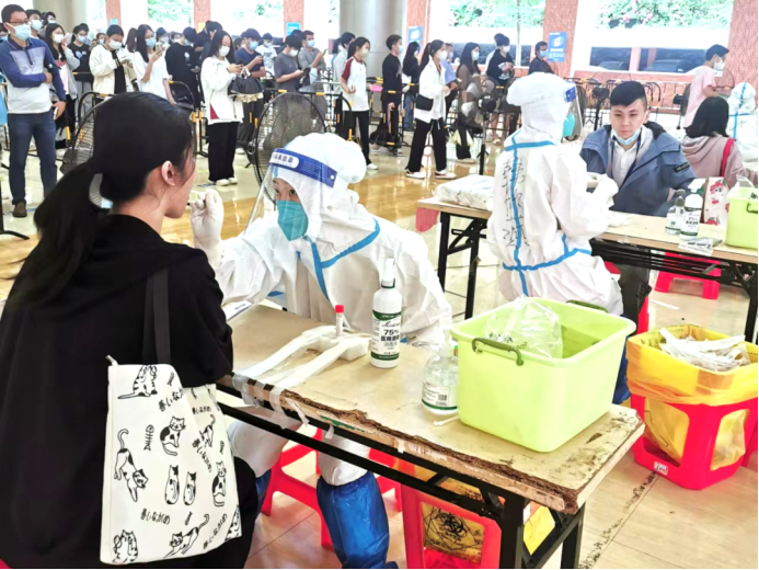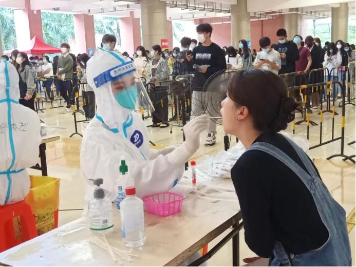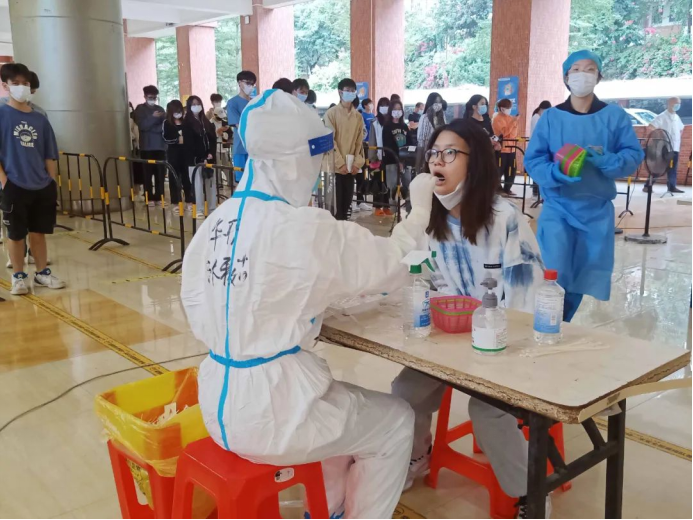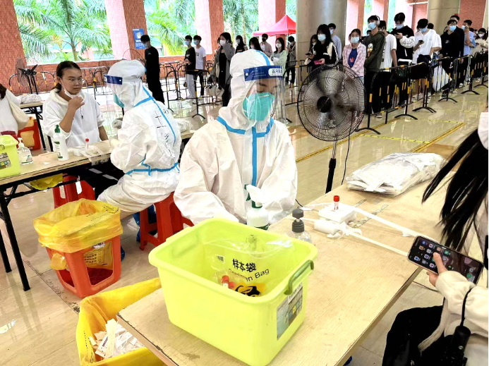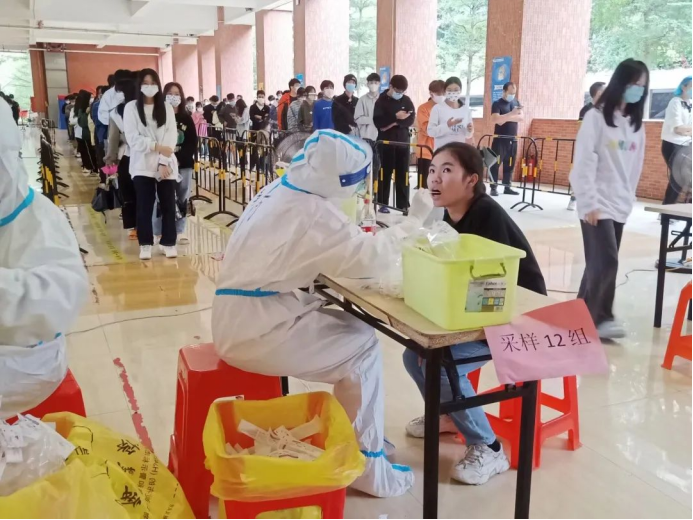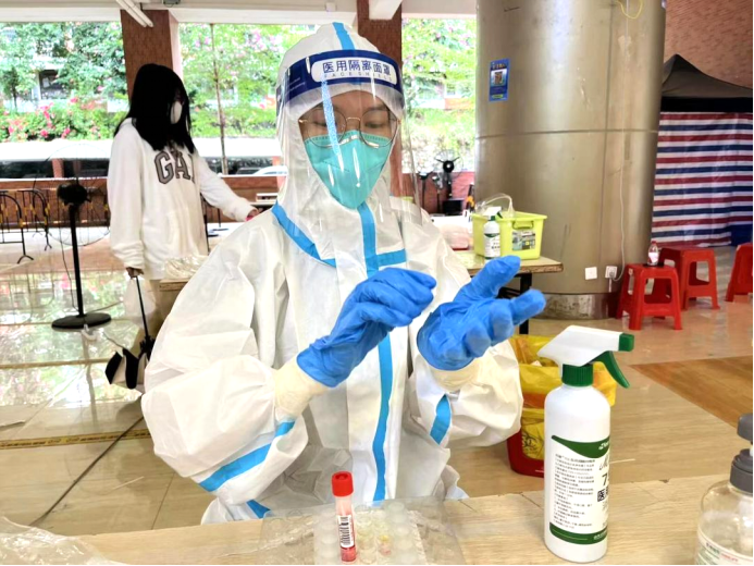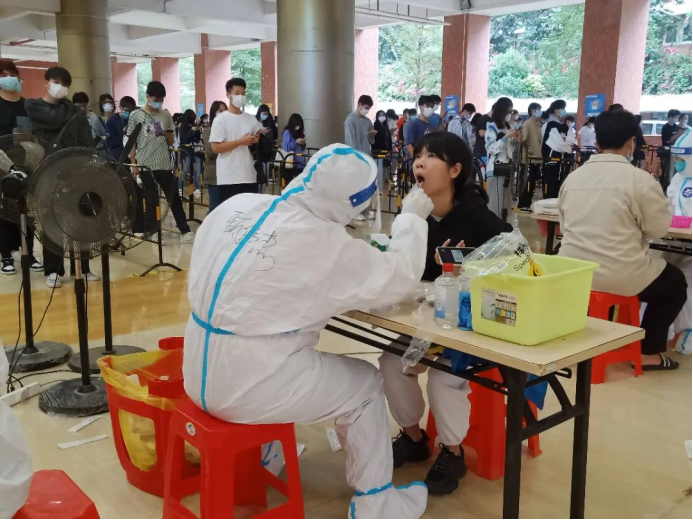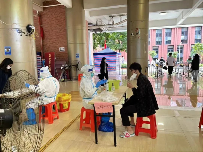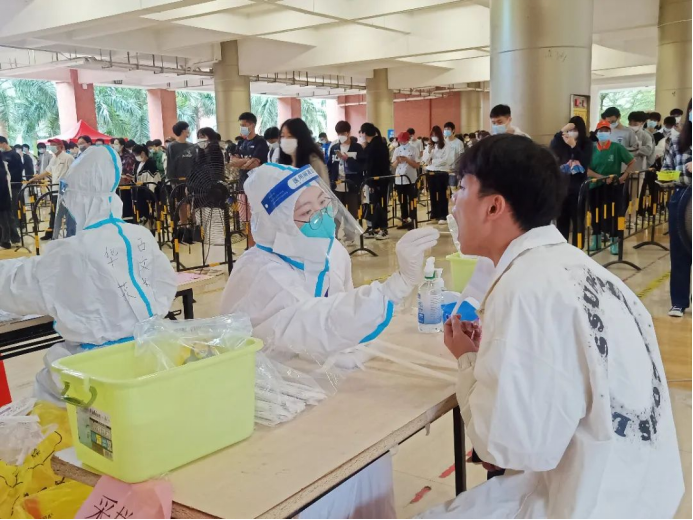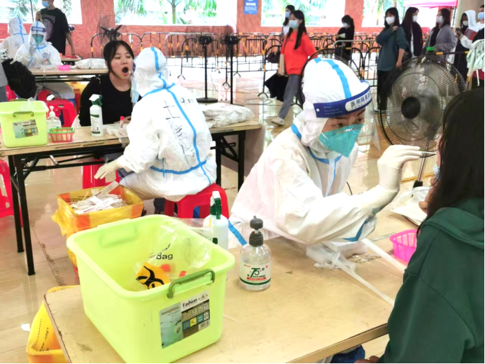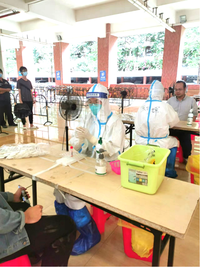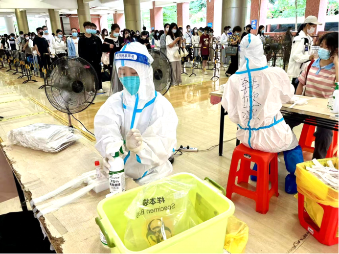 教师志愿者们在疫情第一线挺身而出,他们身穿着医用防护服严谨地清洁消毒,按照正确规范的操作进行,力争在确保速度的同时也能兼顾到核酸检测的质量,充分地发挥着党员先锋模范带头作用。
