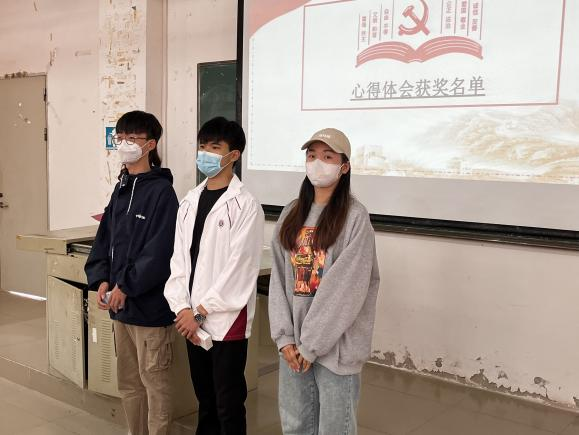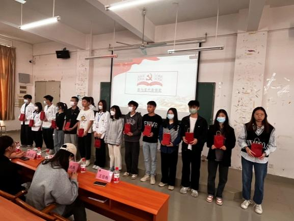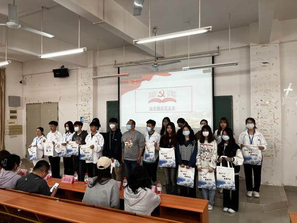 (学生第一党支部组织委员甄伟杰老师为获得“党史抢答题奖”的同学颁奖)