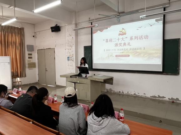 (学生第一党支部书记莫桂遇老师为“二等奖”的队伍颁奖)