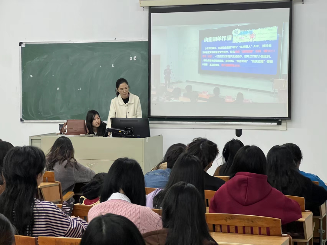 刑警大队队长董悦秀以自身丰富的反诈工作经验,揭露各类诈骗套路,如“兼职刷单诈骗”、“刷单诈骗”、“冒充客服诈骗”、“网络交友诈骗”等手段,为同学们播下认诈、防诈、反诈的种子。