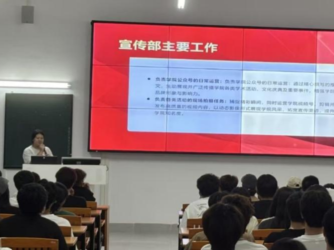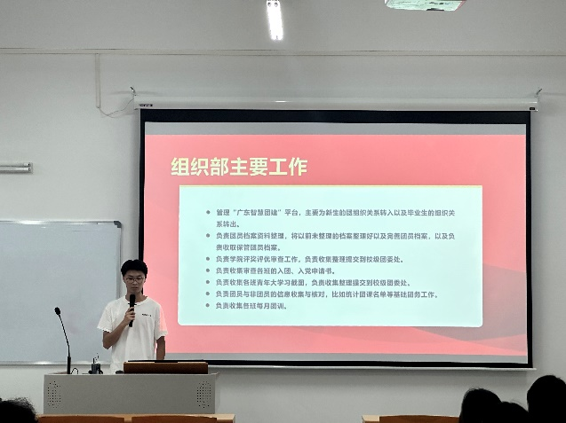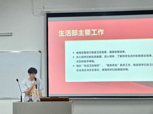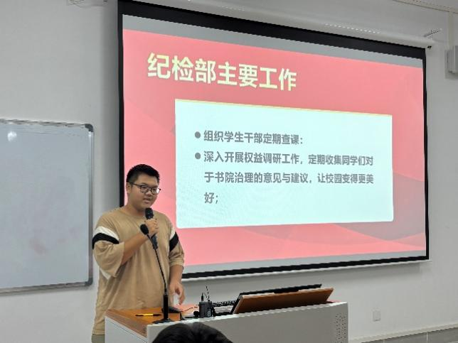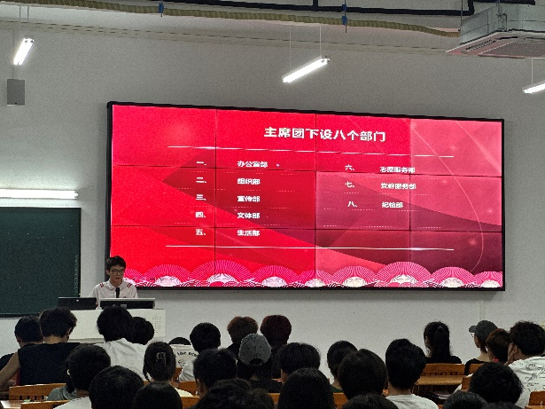 首先,吴炜进向同学们介绍了团委、学生会各部门职能,鼓励大家参与部门工作的同时更要学习好自己的专业课,做全面发展的新时代大学生。