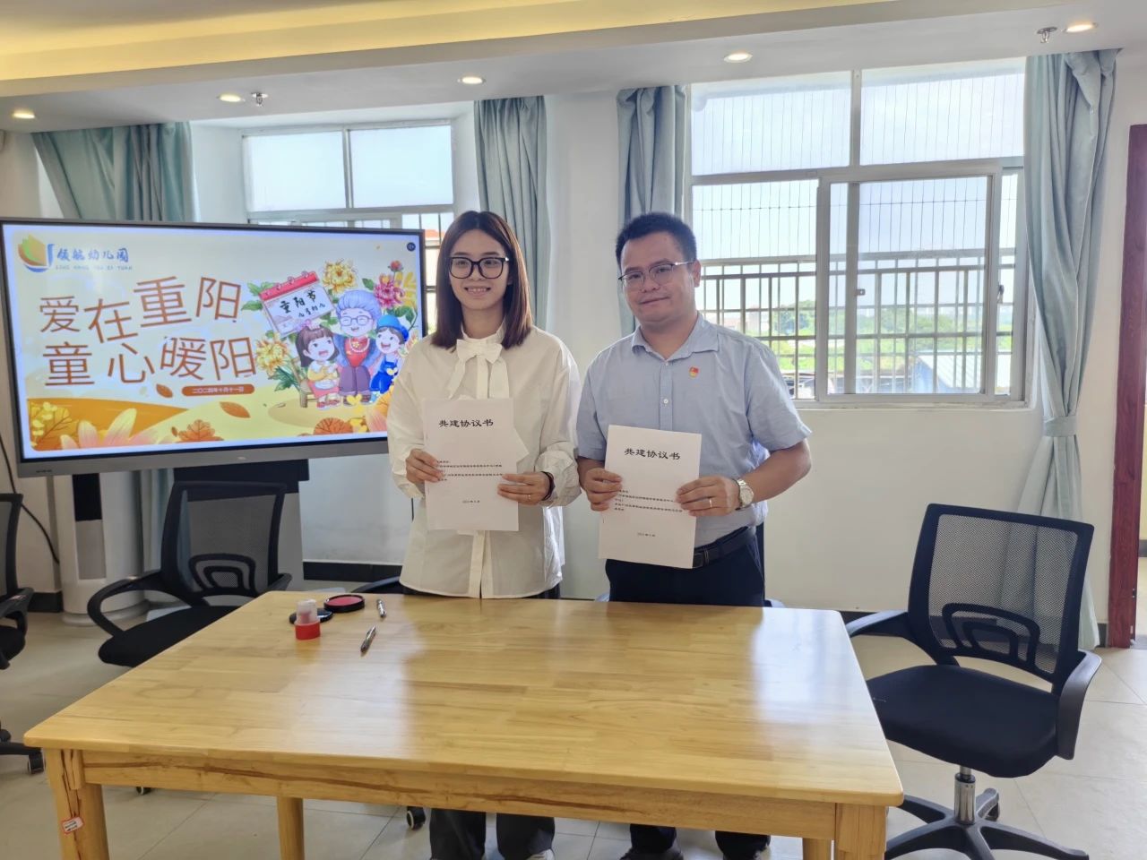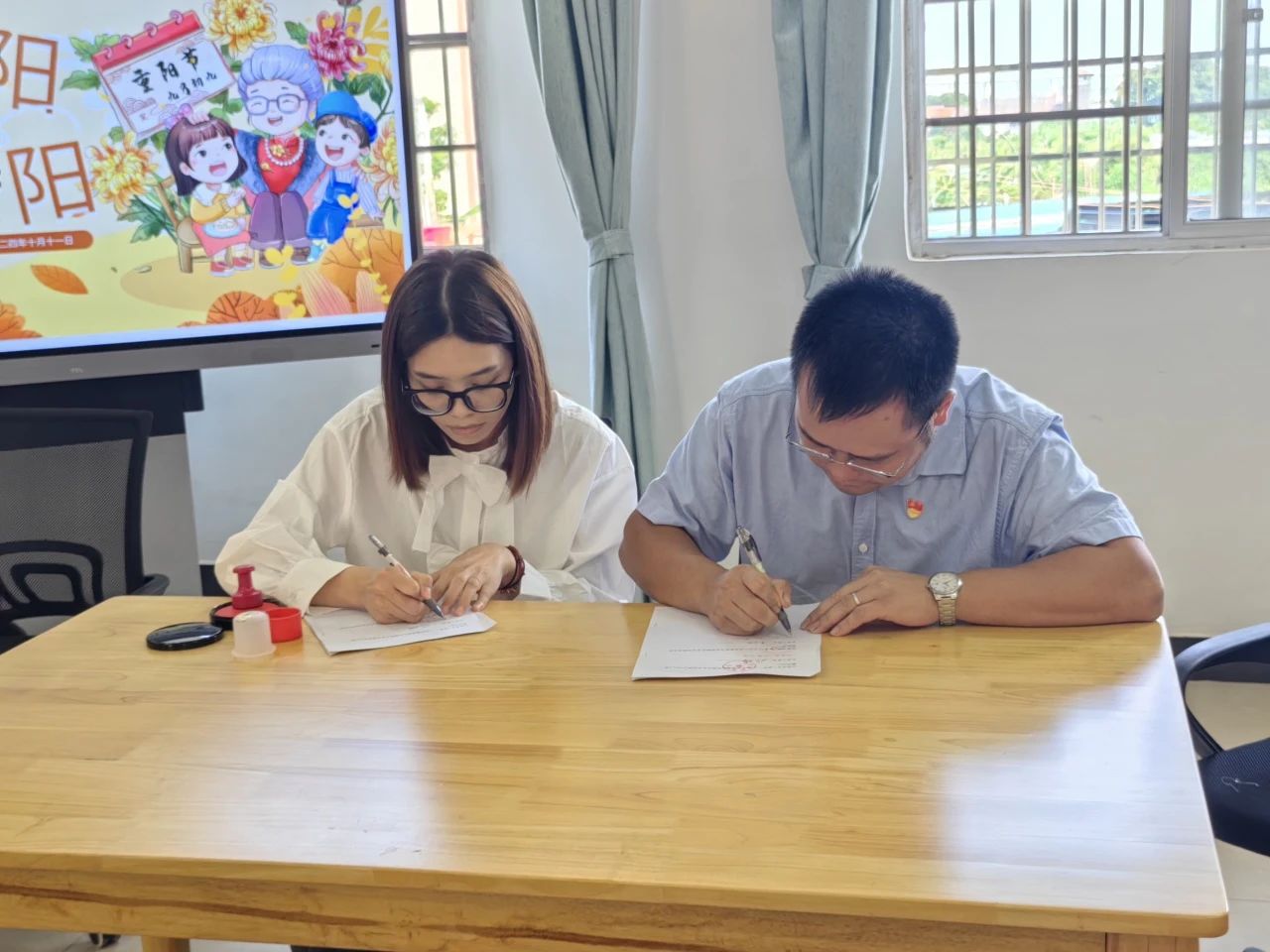10 月 11 日,值此重阳佳节之际,广州华商职业学院数字商务学院与增城区仙村镇颐康中心开启了合作共建新篇章,成功举行校地共建签约揭牌仪式。出席签约仪式的有数字商务学院党总支副书记萧早荣以及其他党员老师,颐康中心主任何玉娟、干事刘凤莹。