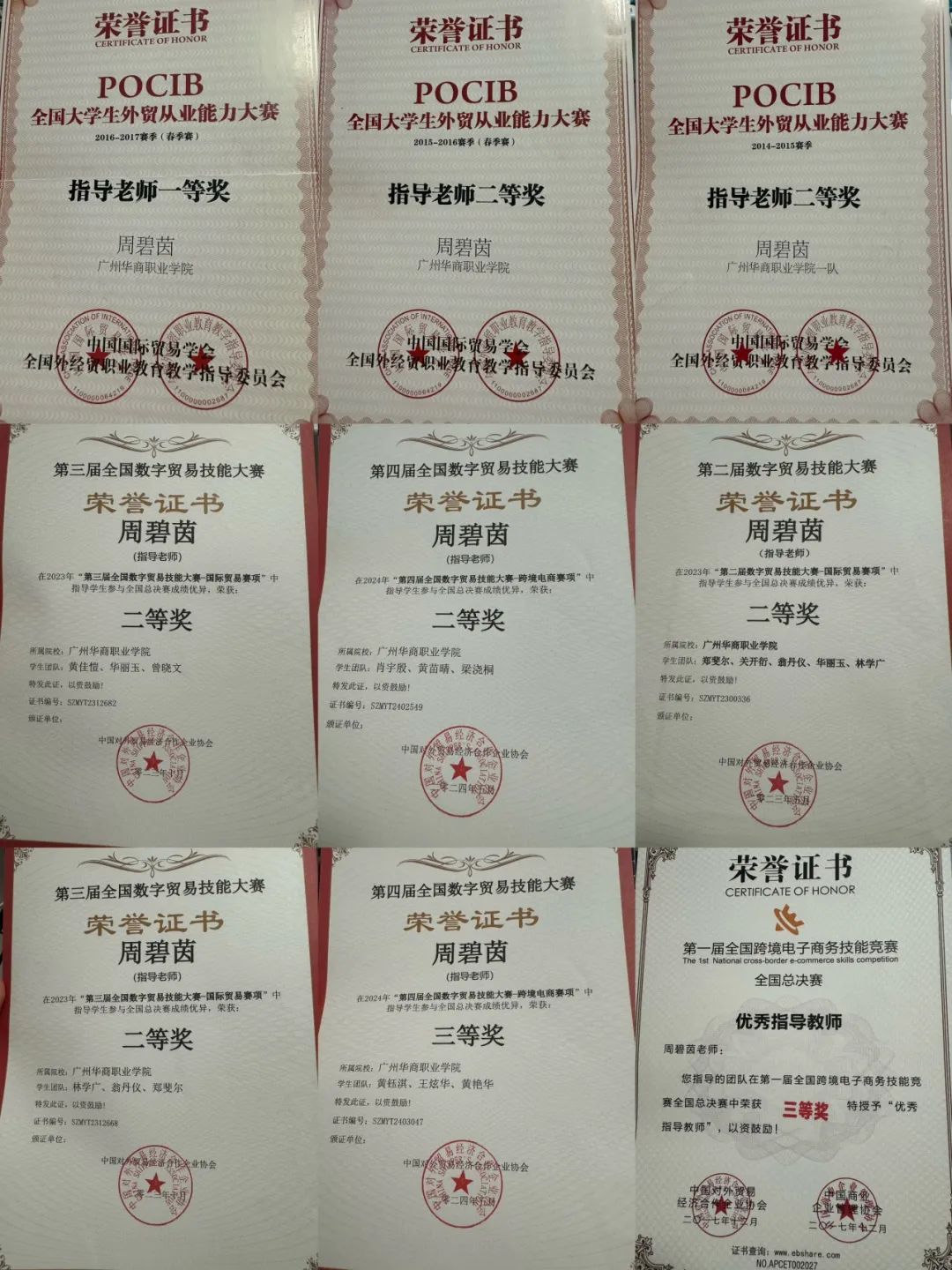 周老师深知参加专业技能竞赛是提升学生专业能力的重要途径。从教以来,周老师先后带领并指导学生参加各类国际贸易、跨境电商专业技能竞赛,并屡获佳绩。其中包括指导学生参加POCIB全国大学生外贸从业能力大赛获全国总决赛一等奖1项、二等奖2项;指导学生参加全国数字贸易技能大赛(国际贸易赛项)获全国总决赛二等奖3项;指导学生参加全国数字贸易技能大赛(跨境电商赛项)获全国总决赛二等奖1项、三等奖1项;指导学生参加全国跨境电子商务技能竞赛全国总决赛三等奖1项。