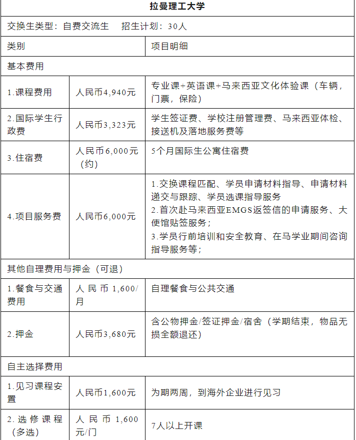 为给我校学生提供与世界一流的综合性大学进行交流与学习的机会,进一步拓宽同学们的国际化视野及提高相关专业知识,我校与海外合作院校马来西亚拉曼理工大学织实施“马来西亚拉曼理工大学2025国际英才交流生”的学习项目。此次将选拔30名学生于2025年2月赴马来西亚参加为一个学期的交流学习。