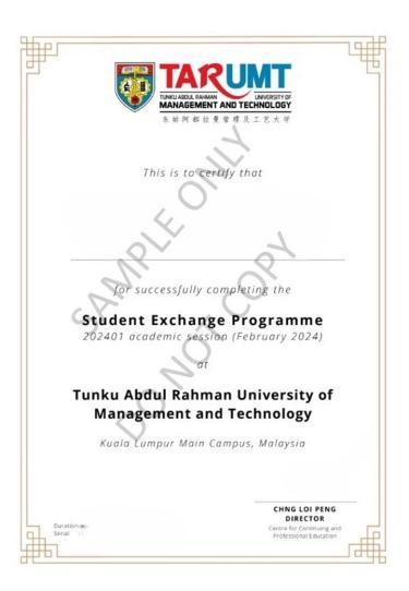 交流期间全英教学,安排语言课程、专业课程、特色文化体验课程、见习项目(选修)。交流结束后马来西亚拉曼理工大学颁发交流证书,向学校提供学生的考试成绩,由学校按照学分管理办法置换学分。