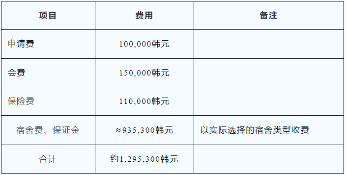 (二)学生自付费用:项目费用(包含:申请费、会费、保险费、宿舍费和保证金,合计约1,295,000韩元/人/学期,折合人民币约6710元/人/学期)、机票交通费用、签证费用、个人消费等。