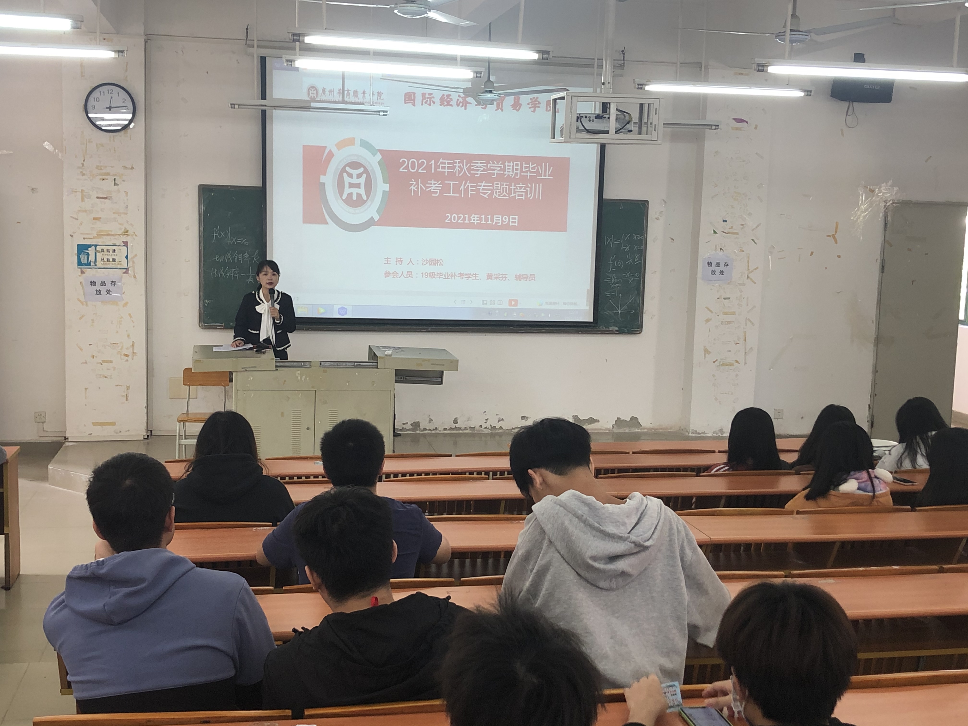 为做好考风考纪教育工作,确保19级毕业补考工作的顺利进行,11月9日中午,我院19级毕业补考动员大会在博C401课室顺利召开。学院教学副院长沙园松老师,教学秘书黄采芬老师,辅导员及全体毕业补考的学生参加了本次会议。