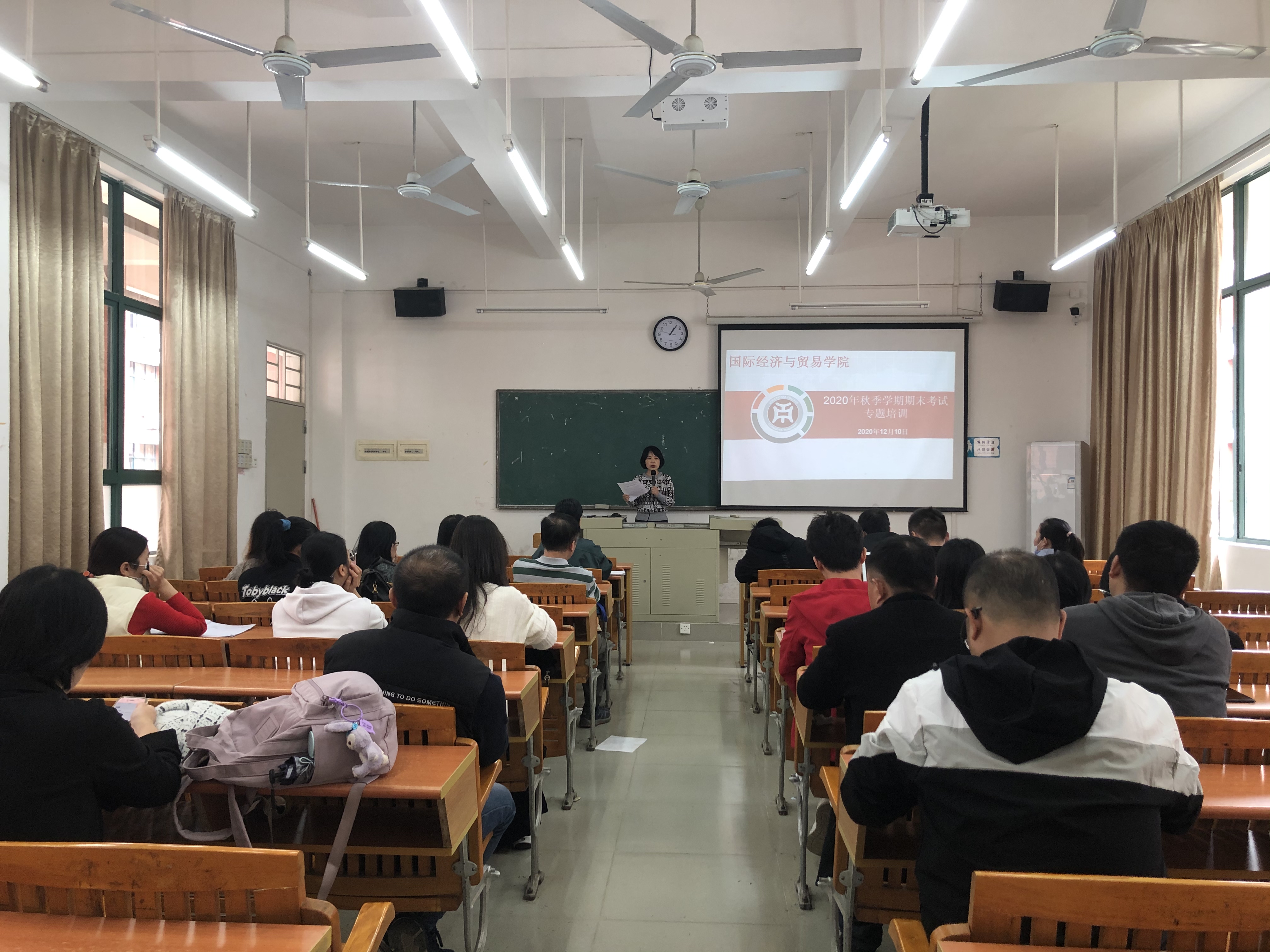 2020年12月10日中午1点,国际经济与贸易学院2020年秋季学期期末考试专题培训会在博学楼B202开展,参加培训的人员有沙园松副院长、张丽菠副院长、全体专任教师和辅导员。期末考试专题培训会的开展为即将到来的2020年度期末考试提前做出了安排和准备。