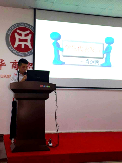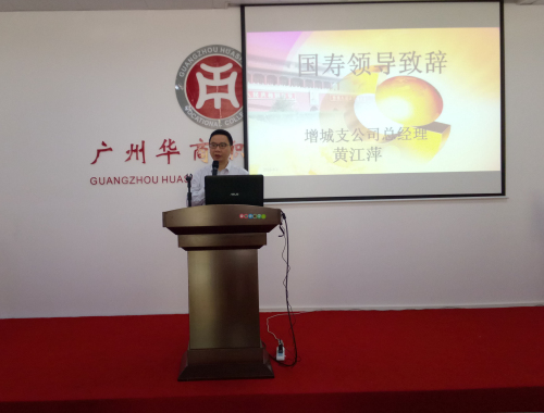 仪式首先由学院詹业宏副院长致词:他希望同学们能够在校外实践过程中要认真自觉,实战过程中提升自己,促使自身的工作能力提高并预祝校企“保险衔接班”举办成功。然后,增城支公司黄江萍总经理发表讲话,他提出中国人寿是中央企业,更加注重人才的培养以及市场人才的培育,我们要忠于选择,踏实、坚定的做好每一件事。随后由国贸系“衔接班”学生代表肖炯南同学发言,他谈到这是一次难得的机会,感谢学院、系领导和公司共同的关爱,会更好地去接受挑战。最后,由国贸系祁建主任进行学习要求寄语:希望同学们能对事物有全面的认识,不能执着于偏见;再者,踏出校门,要牢记自己的双重身份:既是华商学生又是保险公司员工;要遵守保险公司的规定、要求、规章制度;既然选择了就坚持到底,不要半途而废。