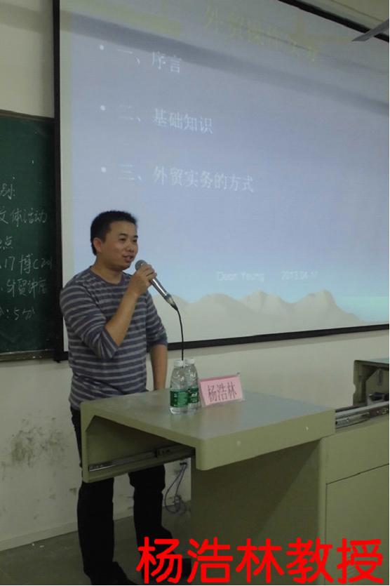 2013年4月17日下午四点,我系有幸邀请到中山市巨峰贸易有限公司的副总经理兼我院客座教授杨浩林先生莅临我院对我系学生进行讲座指导,本次讲座以“外贸操作实务”为主题在博学楼C201拉开序幕。国贸系祁建主任、曹迪副主任、系党总支副书记潘虹老师以及国贸系众多师生出席此次讲座。