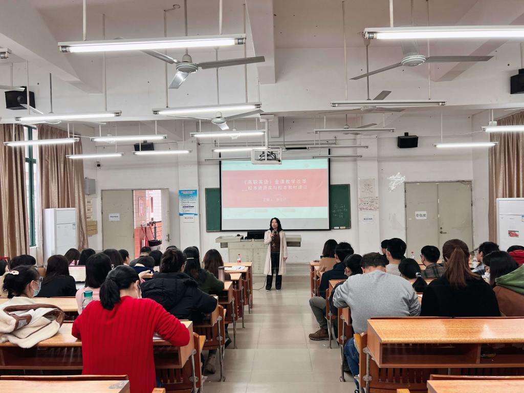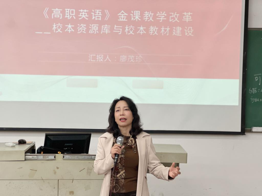首先,大学英语教研室主任廖茂珍副教授以《高职英语》金课教学改革——校本资源库与校本教材建设为主题,讲述了校本资源与教材建设的意义、思路、设计要素、注意事项等。廖老师结合高职教育的发展趋势,阐释了“金课”的两性一度——“高阶性”、“创新性”和“挑战度”,帮助大家进一步加深了对“金课”内涵的理解,并由此分析了建设“金课”的意义及迫切性,更在课程思路和设计上提出了建设性意见和方案,强调“金课”建设是人才培养的需要和新时代教学改革的必经之路。我们将融合现代化信息技术手段,设计符合现代教学要求的课程,更好地实现个性化教学和学生的全面发展,真正让学生主动学习、快乐学习、有效学习。