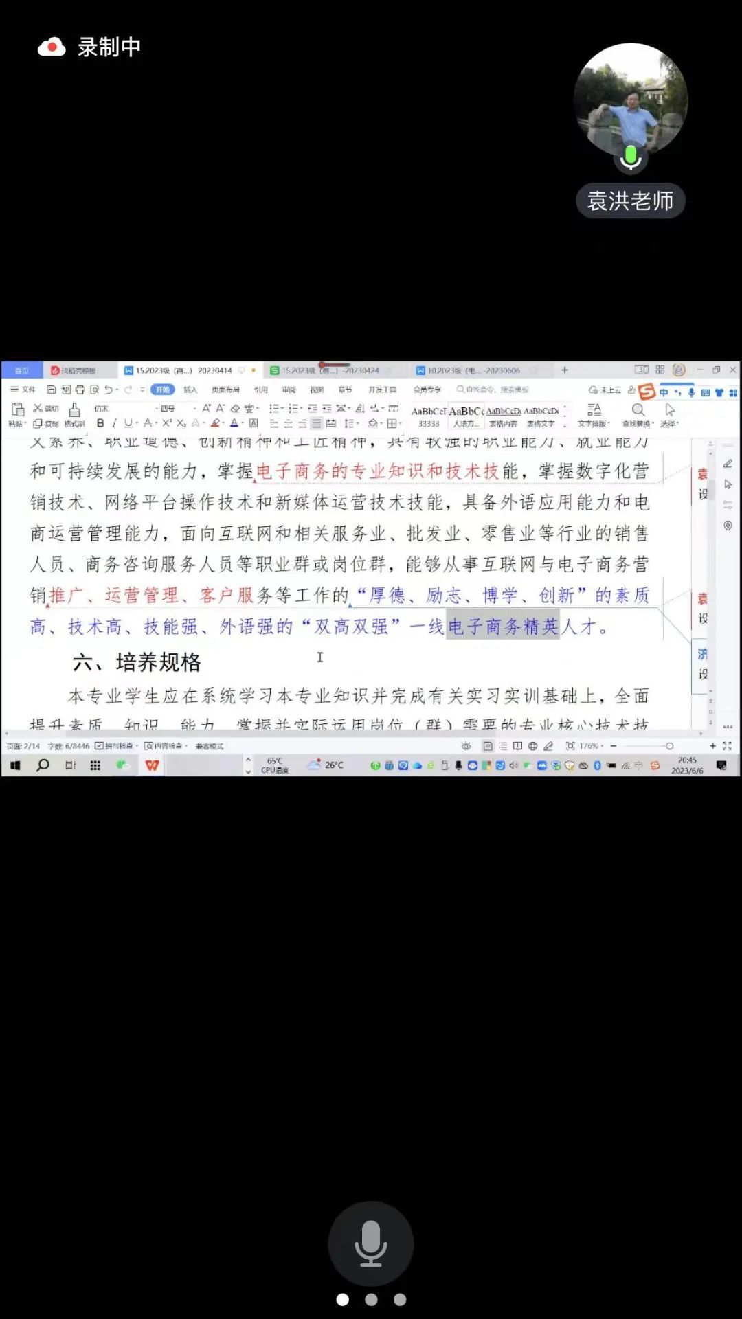 为进一步提升我院专业建设管理水平,充分发挥校内外专家对专业建设与改革的研究及指导作用,6月6日晚上8点,我院在线上腾讯会议召开2023级人才培养方案论证研讨会。特邀广东省外语艺术职业学院外语应用学院院长袁洪教授,深圳头狼跨境电商有限公司朱加宝总经理,华南跨电研究院杨巍总经理三位校外专家为我院2023级所有专业人才培养方案论证作指导。院长梁悦教授、沙园松副院长、张丽菠副院长、各专业负责人及教研室主任、秘书等共13人参加了论证研讨会。此次会议由院长梁悦教授主持。