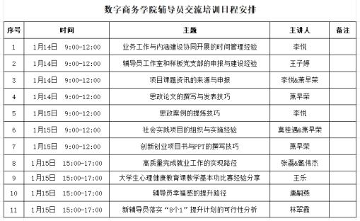 为落实立德树人根本任务,不断提升辅导员队伍的适应性,创建“学习型、创新型、服务型”辅导员团队。1月14日—15日,数字商务学院举办辅导员素质能力提升交流会。