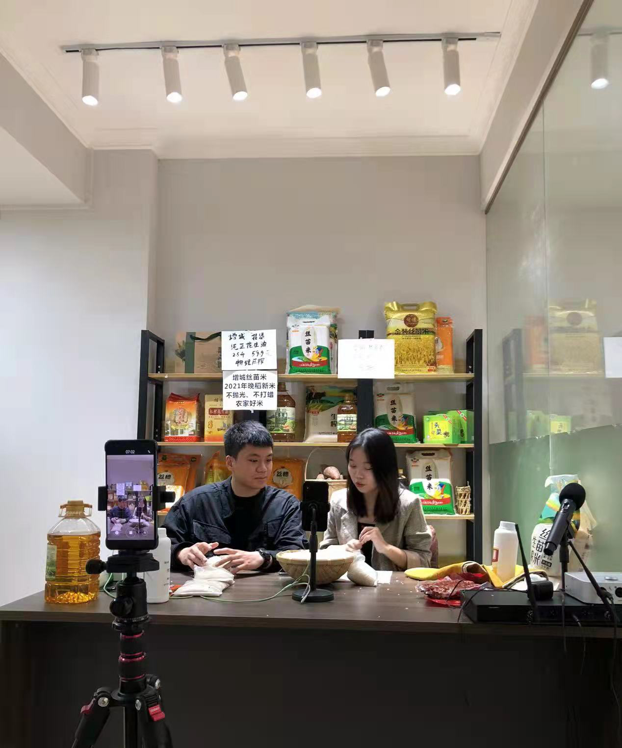 8点45分,,两名学生主播经过几分钟的准备后,开启了一场精彩的增城本土丝苗米直播。因为两位主播对于产品信息非常熟悉,加上彼此默契,整个直播间气氛热烈,两人的讲解就像一场精彩的脱口秀,引得粉丝们纷纷点赞。