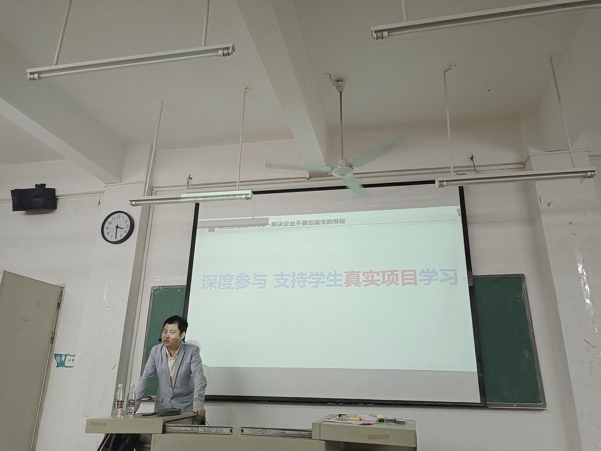 张丽菠副院长首先对朱总的到来表示热情欢迎和感谢。宣讲会开始,朱总通过视频、PPT展示,首先分享了当前就业现状与择业问题,介绍当前热门岗位并解析岗位要求,结合社会现状,着重介绍其华南产业园概况、优势和人才成长计划,对薪资待遇福利等各方面信息,进行详细宣讲。希望以其项目化、系统化的岗前学习培训促进学生精准择业、就业。