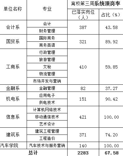 2017年1月9日,2017届毕业生离校第三周到岗率统计情况公布如下图。希望未落实单位的同学们尽快到岗,及时完成顶岗实习相关任务。