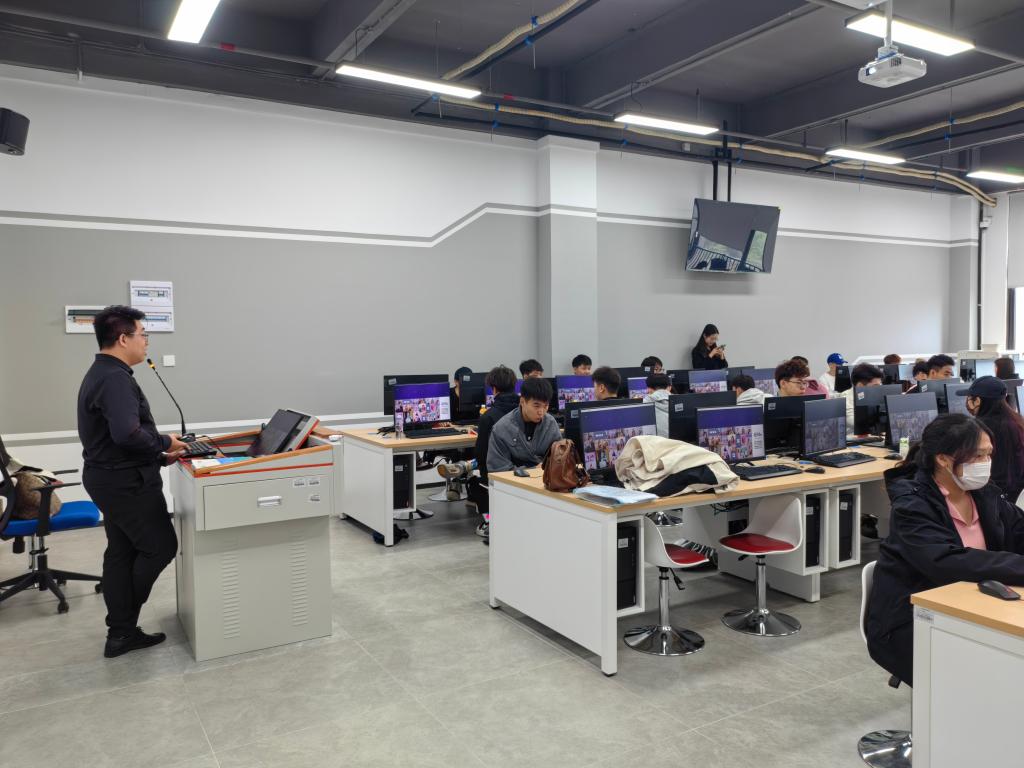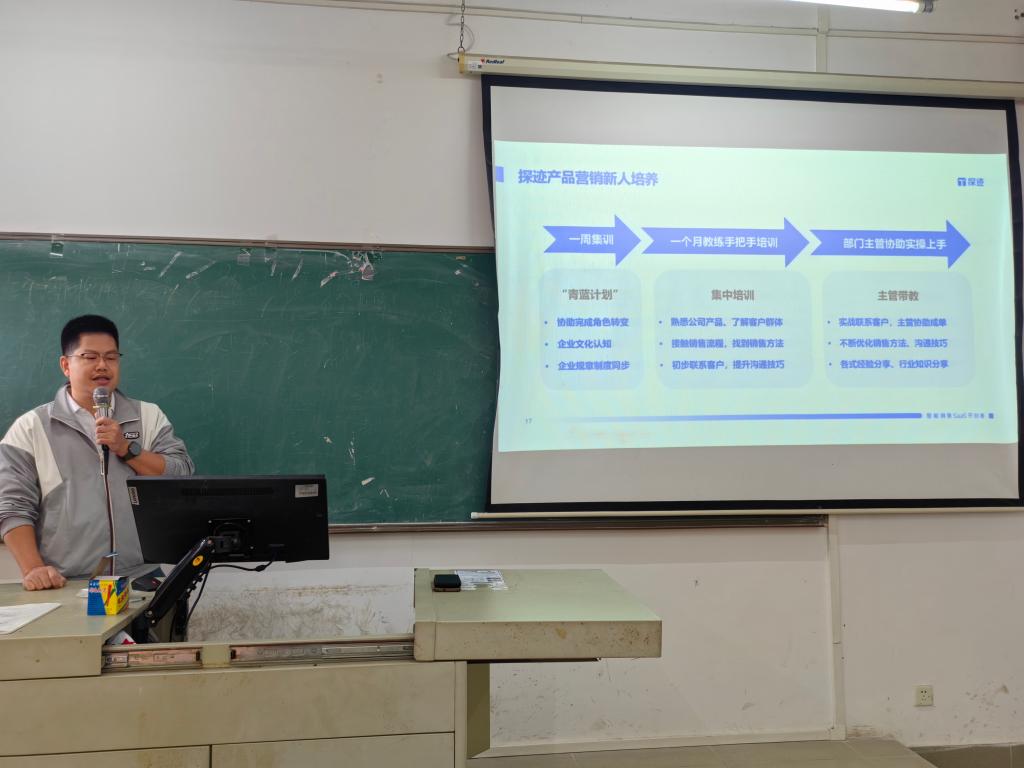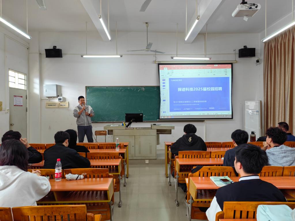 广州探迹科技有限公司数字经济产教合作中心主任何本炫详细地介绍公司情况、发展历程和前景、核心技术、技术创新,用最直观、简单的方式让学生快速地了解公司,明确用人岗位要求、薪资待遇与发展前景等内容。力求为我院市场营销、物流管理、电子商务等专业提供更多的实践机会和职业发展路径。