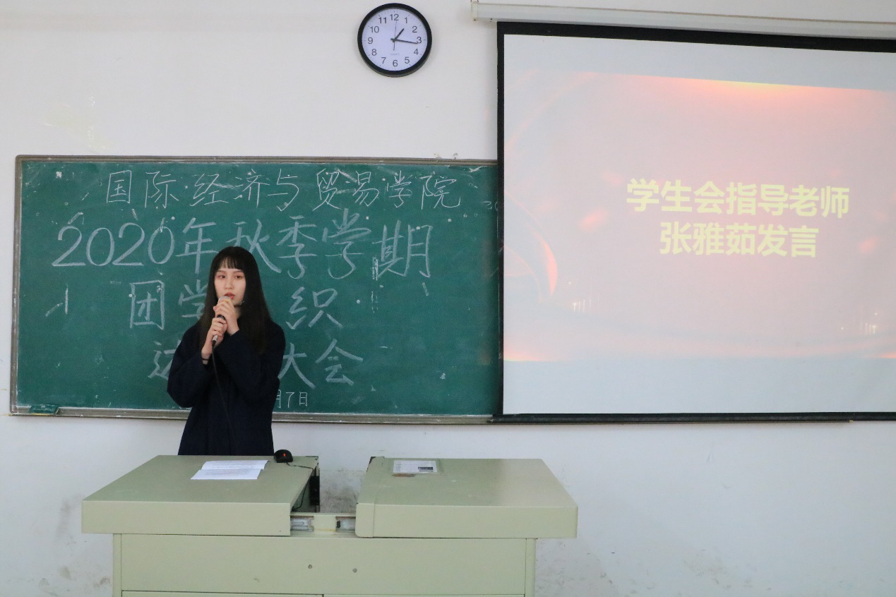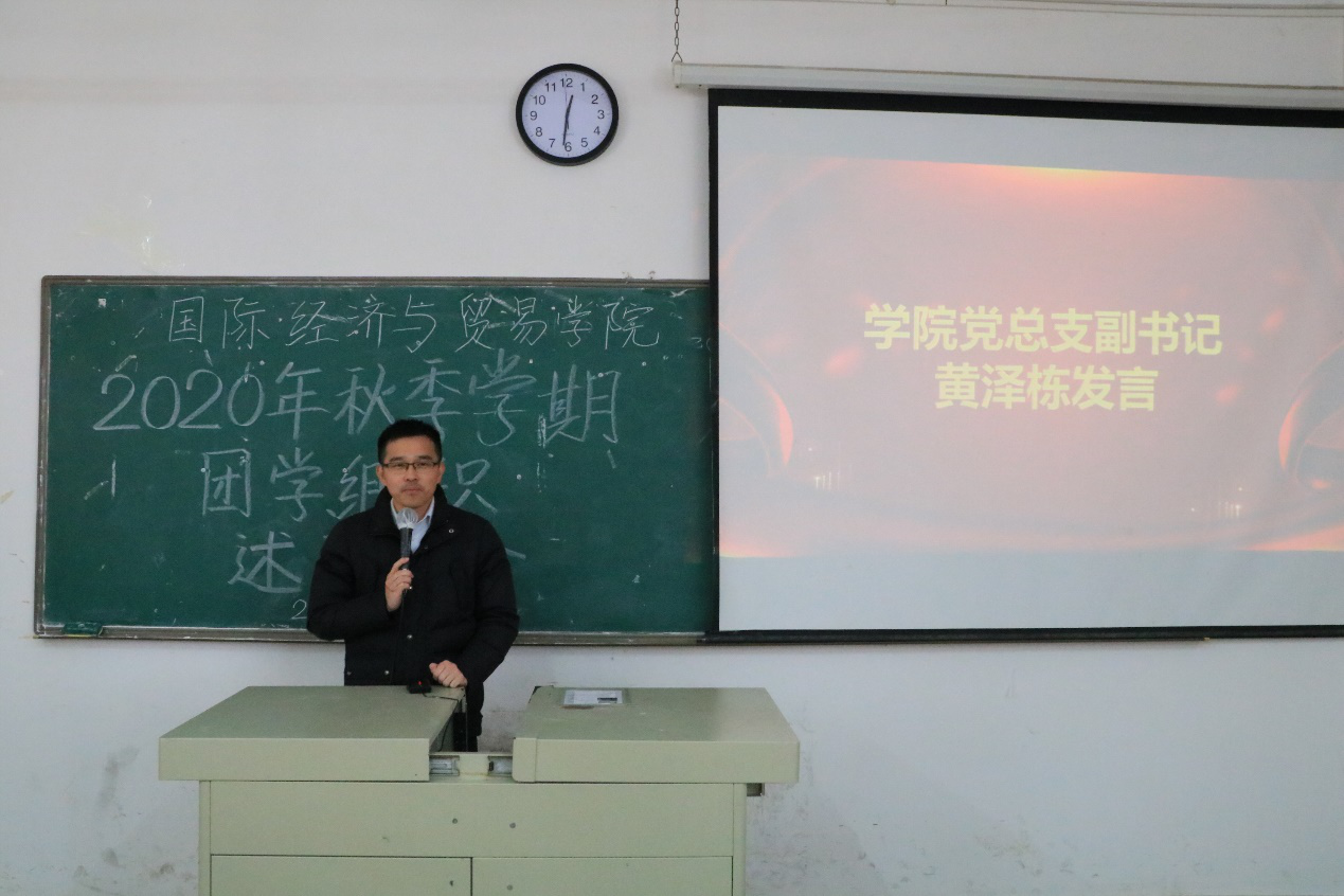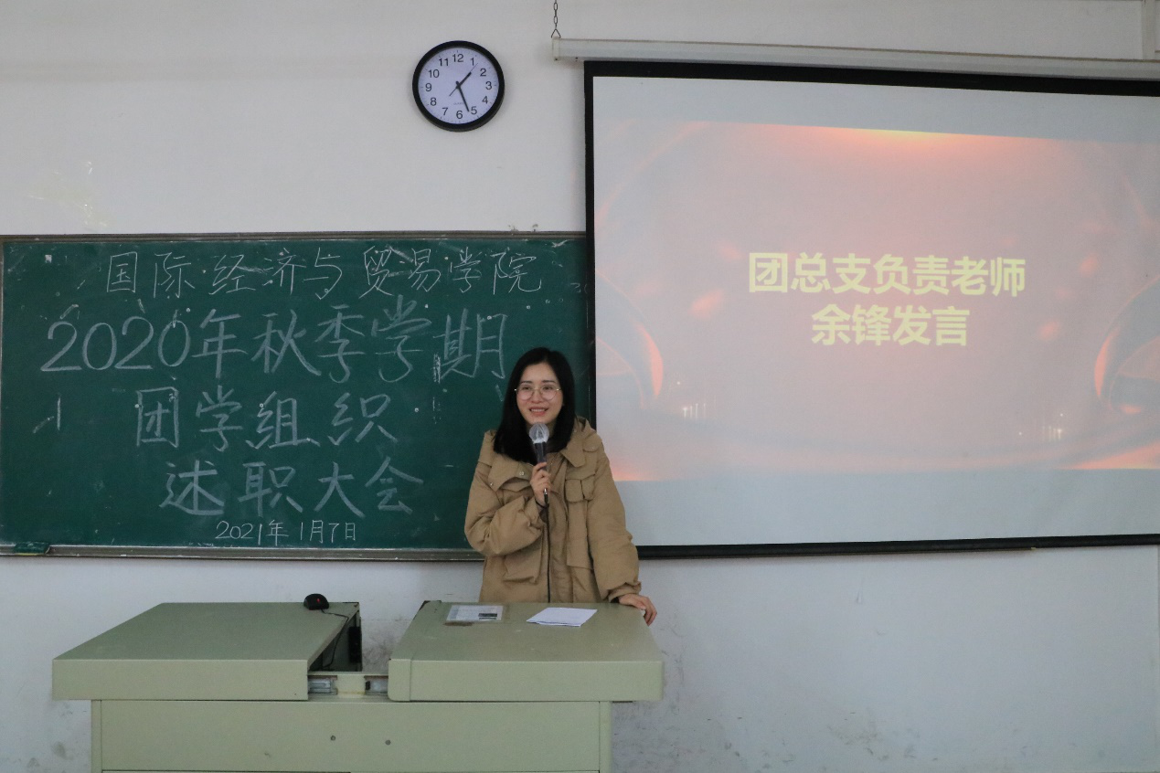 为推动我院团学组织工作的长足发展,提高团学组织成员的工作热情和质量,我院于2021年1月7日中午12:00在博学楼B202召开国际经济与贸易学院2020年秋季学期团学组织述职大会。莅临本次大会的领导老师有学院党总支黄泽栋副书记、团总支负责老师余峰老师、学生会指导老师张雅茹老师。