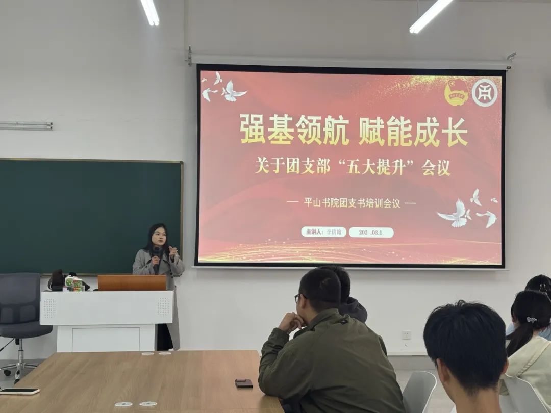 为深入贯彻落实共青团中央关于基层团组织规范化建设的工作部署,全面落实《广东高校学生团支部 “五大提升” 行动实施方案》工作要求,切实提升基层团组织的组织力、引领力、服务力。2025 年 3 月 17 日中午,平山书院团委在教工科楼 507 会议室举办“聚焦 ‘五大提升’ 行动, 筑牢基层团组织堡垒”培训会议。本次会议由团委组织部部长李信翰主讲,参与本次培训会的有23、24级团支书、组织委员,23、24团委骨干。