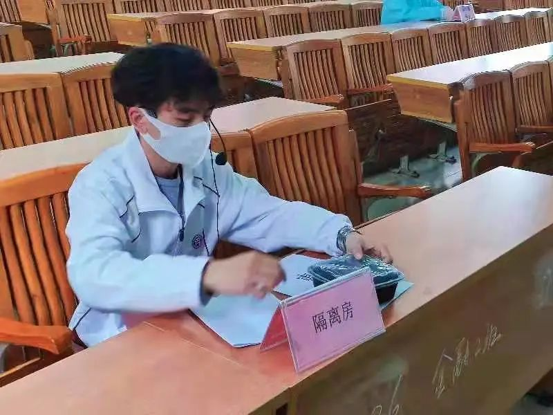学生甲回学校隔离房宿舍停课治疗,等待检测结果,志愿者负责帮忙打饭送到隔离房门口。