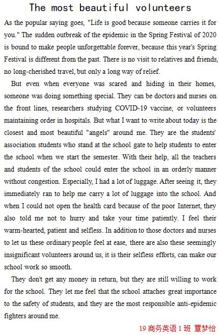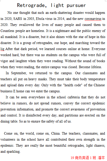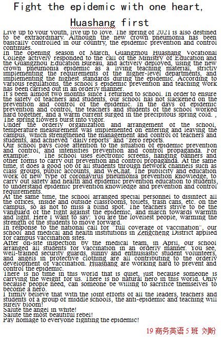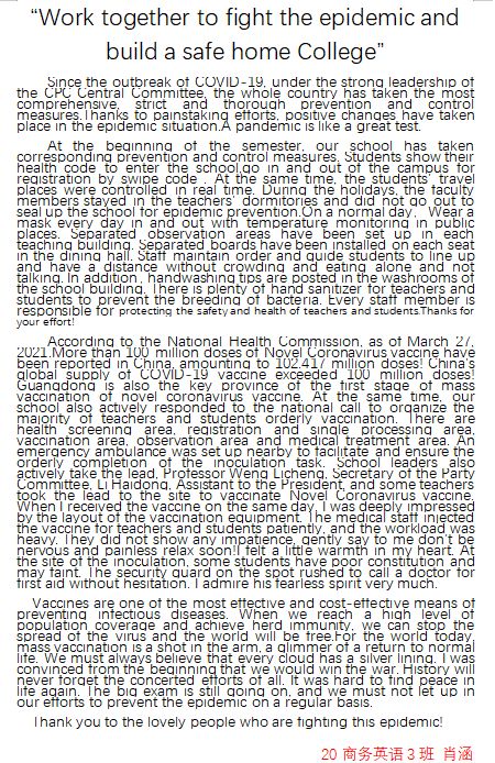 通过此次英语征文活动,让同学们将自己的情感、信念、防疫意识通过自己的文笔展现出来,不但提高了同学们的防疫意识,也提升了同学们的写作能力,为我们的大学生活增加亮色,更是让我们校园的原创英文作品有了一个展示的舞台。