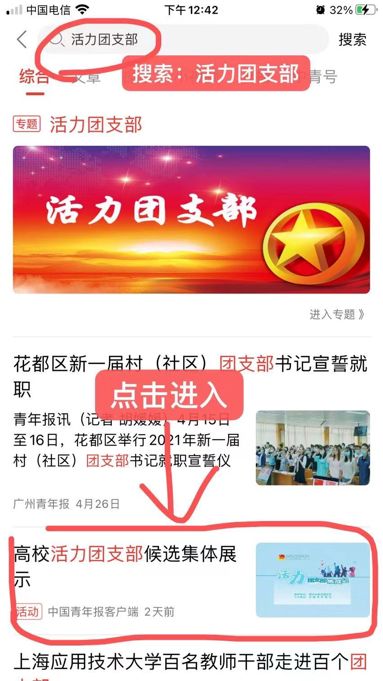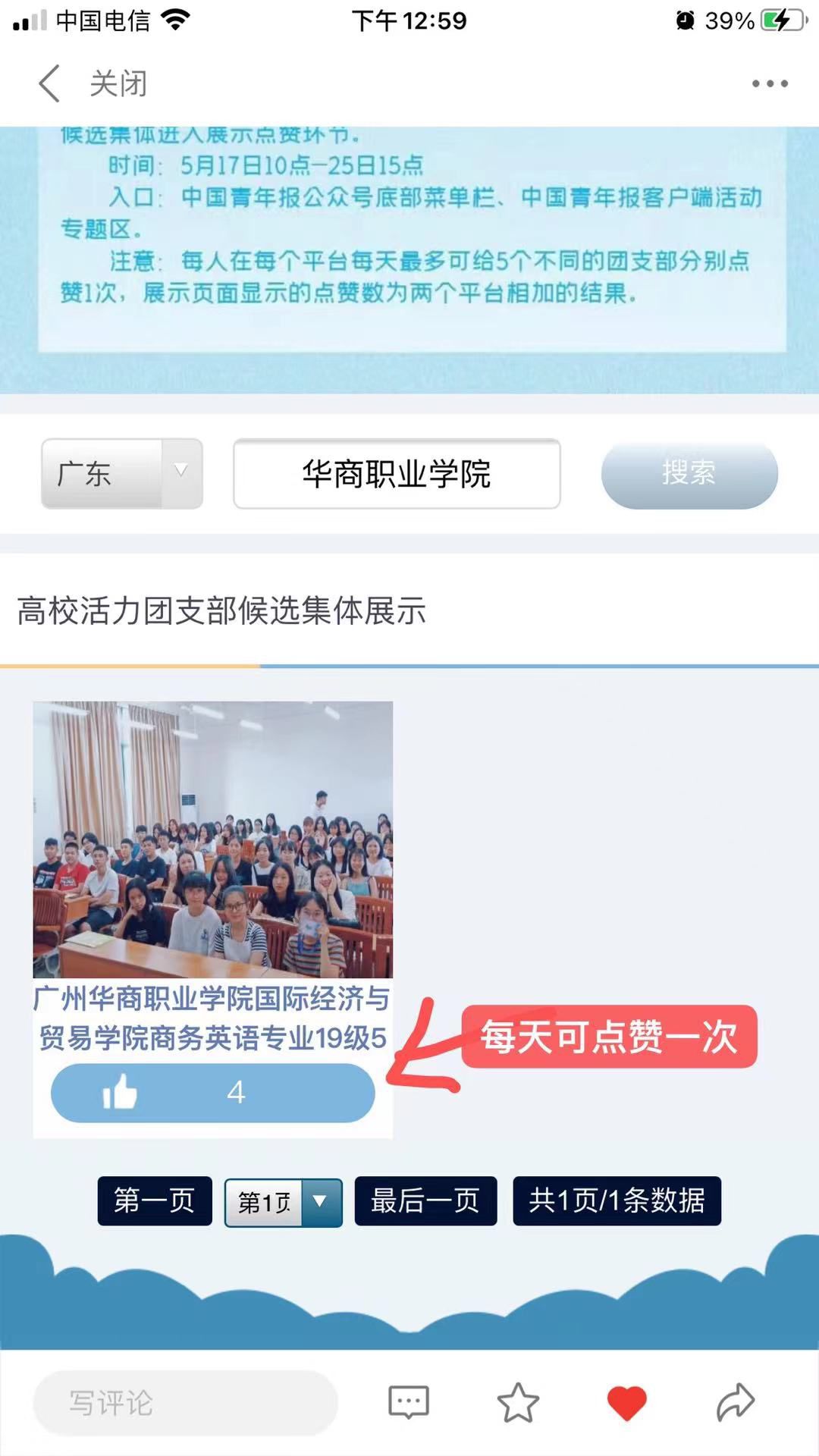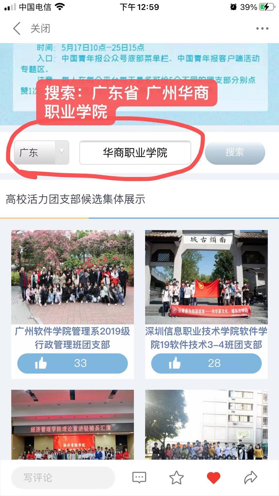 方式二:下载“中国青年报”客户端,进入活动专题区,搜索“高校活力团支部”,点击相关活动,进入投票界面,进行投票。(下载中国青年报app、栏目搜索“活力团支部”、找到高校活力团支部候选集体展示并点击进去、然后在栏目里找到“广东”并填写“华商职业学院”即可助力点赞。这四部分的图示如下: