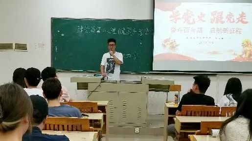 班会伊始,主讲人心理委员陈晓棉同学宣读了本次会议的主题并说明了会议流程。接着他讲述了中国共产党从建党之初到建党百年的奋斗史,在弘扬红色革命精神的同时他表示我们大学生在学习、生活方面遇到困难不应低头,应该学会用红色革命精神去激励自己直面挫折,才能更好地认识今天,开创更好的明天。