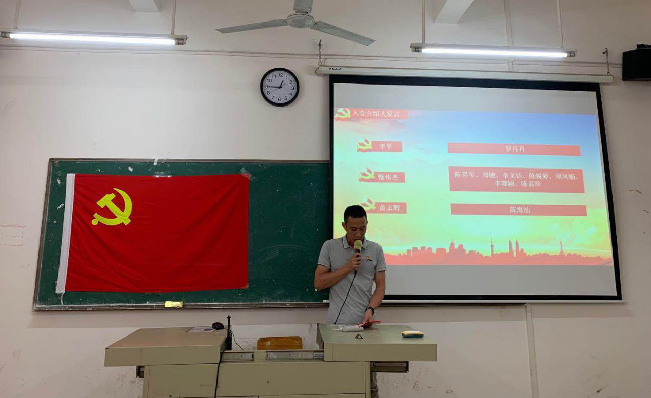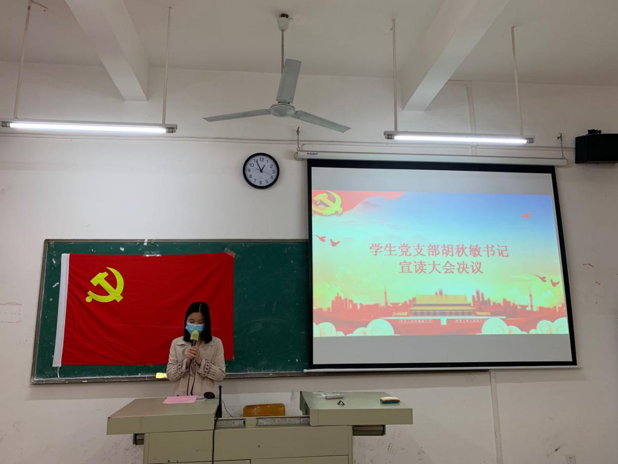 大会最后,由学生党支部胡秋敏书记宣读关于同意接收陈锐婷等9名发展对象为中共预备党员的大会决议。