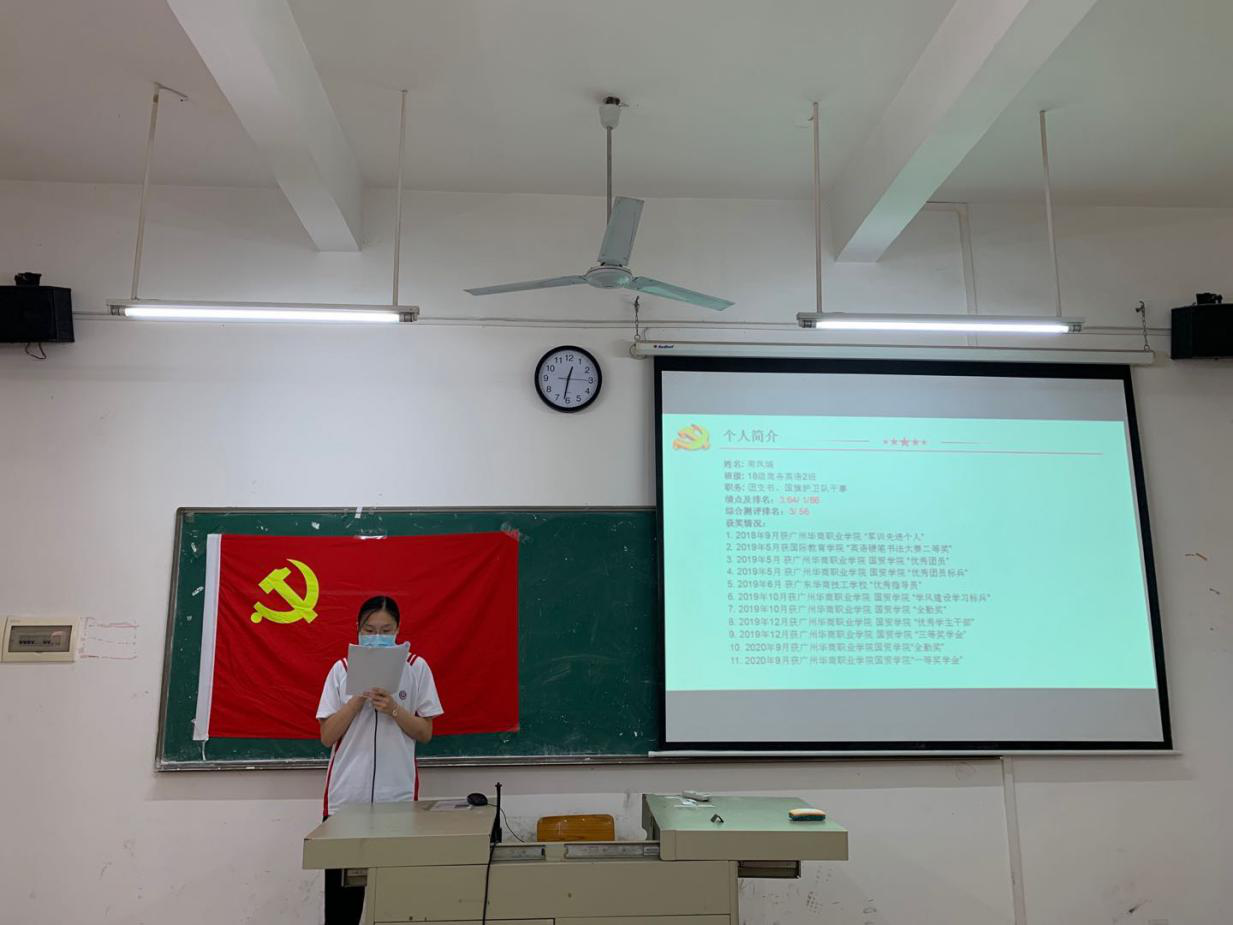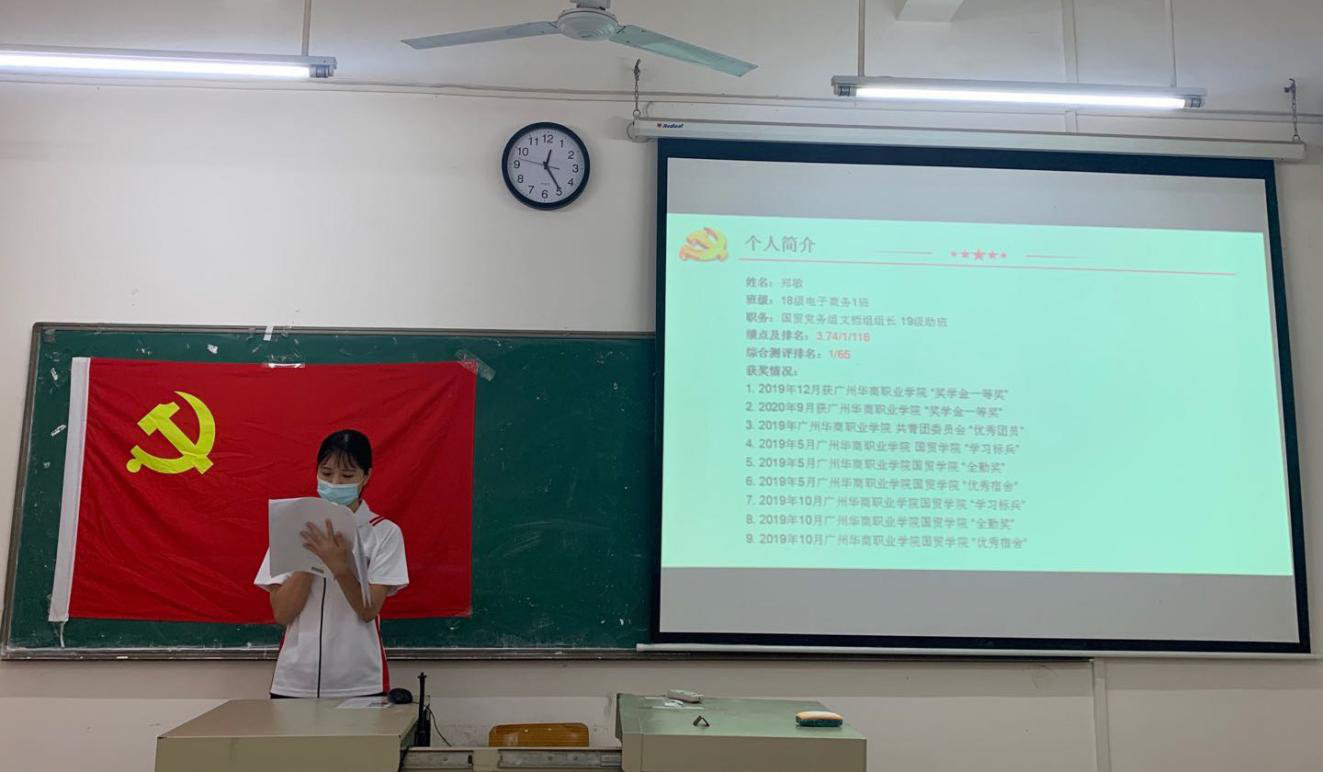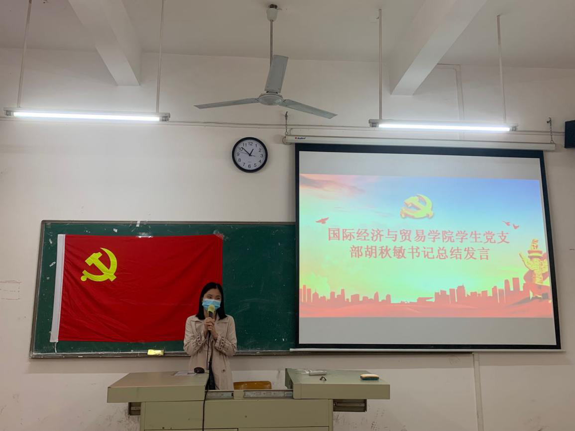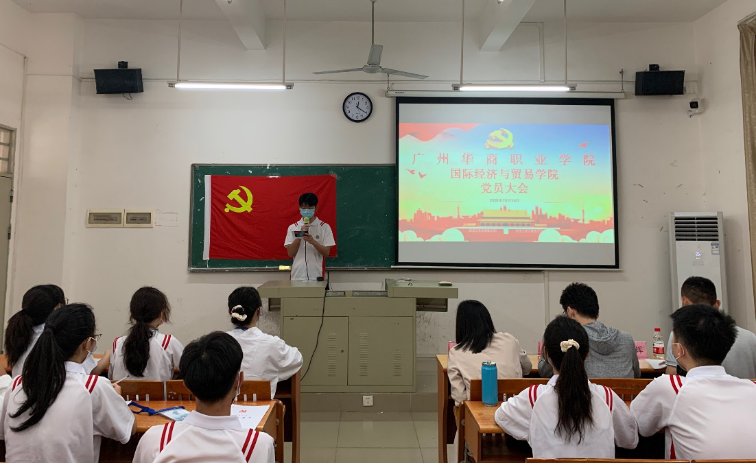 10月14日中午12:20,国际经济与贸易学院学生党支部党员大会在博学楼C207召开,出席本次大会的有学院学生党支部胡秋敏书记、教工党支部黄志辉书记、学生党支部黄炬岱副书记、辅导员甄伟杰同志、全体学生党员以及2020年秋季上半学期发展对象。