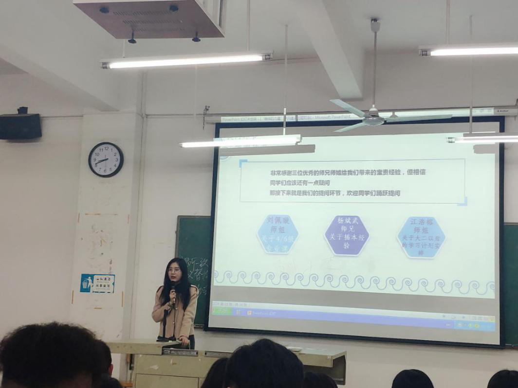 刘佩璇师姐为我们分享了四六级详细备考经验,提醒同学们在大二要尽力参加各种比赛活动,不给大学生活留下遗憾。